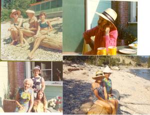 Helen with Dee Dee, granddaughter Eve and a visitor at the McBride cabin and beach at Queen`s Bay, near Balfour (McBride Collection)