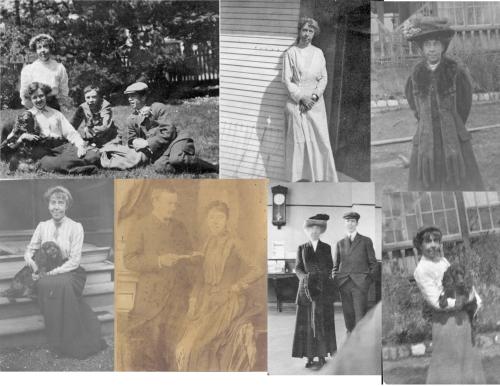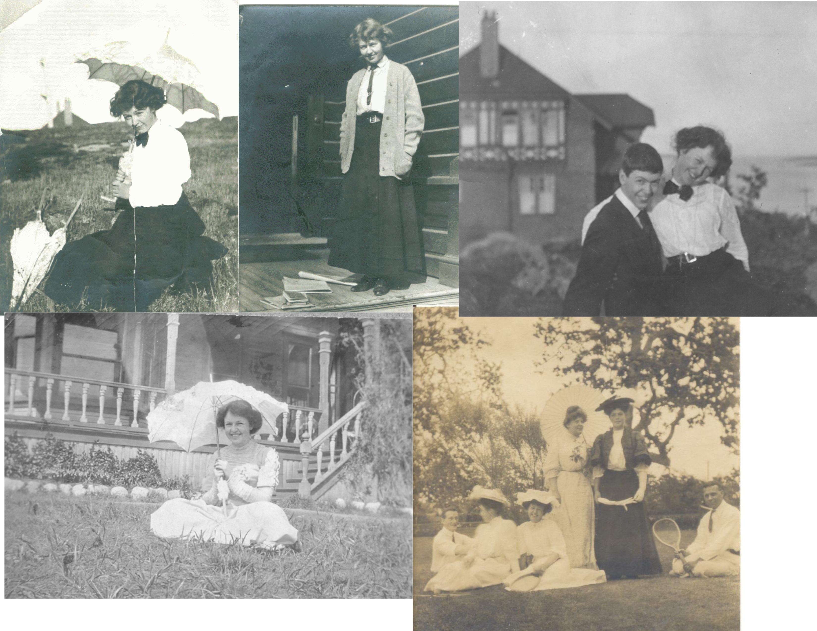 clockwise, from bottom left: three images of Helen as a young lady in Victoria; with her brother Gerald in the yard of their Oak Bay home; seen with tennis friends (McBride Collection)