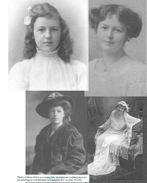 Ted and Helen married June 19, 1912 at St. Paul`s Anglican Church in Esquimalt, adjacent to Victoria. Her father Frederick Peters could not attend because he was tied up with his work in Prince Rupert. He asked his cousin, Colonel James Peters, to fill in for him in “giving the bride away”. Col. Peters had retired recently after an eventful 42-year career with the Canadian military, including many years in charge of West Coast defence. When he arrived in Victoria in command of the first battery to defend Victoria and the Esquimalt Naval Base he was the first of the Peters clan to settle in B.C. The wedding reception may have been something of a reunion for Col. Peters and another prominent guest, the Hon. Edgar Dewdney. Twenty-five years earlier Dewdney was Lieutenant Governor of the Northwest Territories and Minister of Indian Affairs during the Riel Northwest Rebellion, in which Col. Peters (then a captain) was in charge of an artillery battery and was honoured with a Mention in Dispatches. For further information on Col. Peters, see http://www.navalandmilitarymuseum.org/resource_pages/coastal_defence/james_peters.html.