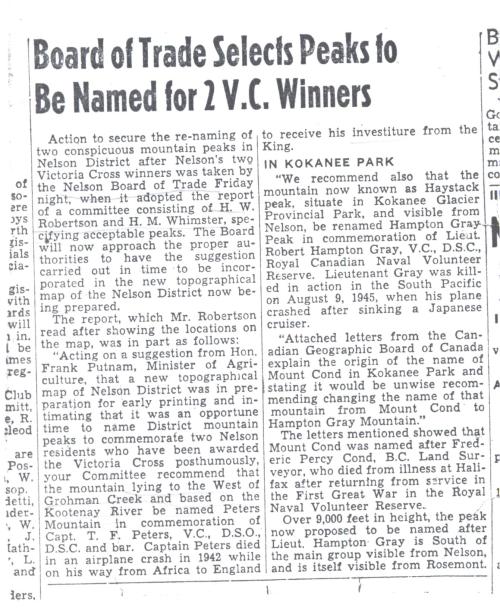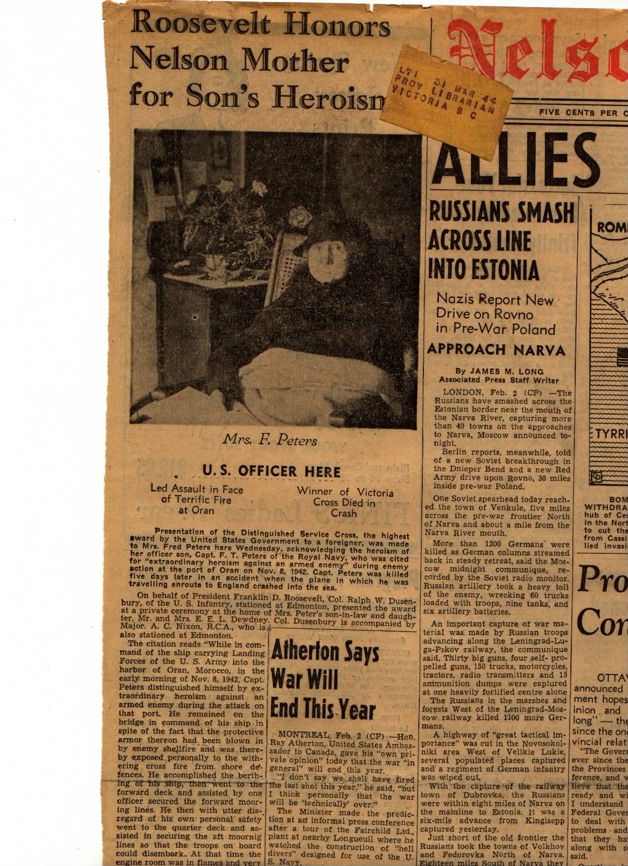 Dee Dee earned a bachelor of arts degree at UBC and then a professional librarian certificate at the University of Toronto. In 1944 Peter married Maxine Forbes-Roberts of St. John`s, Newfoundland, and in 1948 Dee Dee married Nelson lawyer Leigh McBride, who had served as a major in the Seaforth Highlander regiment of the Canadian Army in the Allied invasions of Sicily and Italy.