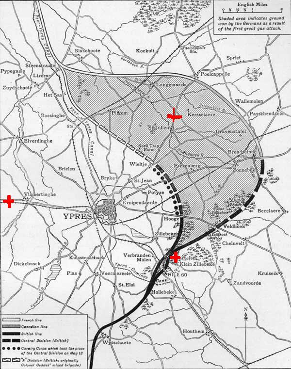Map of Ypres battle area. Top cross is approximately where Jack died; cross at right is where Gerald died; and cross at left is on the road to Poperinghe, Belgium where their cousin Eric Poole was buried after execution for desertion.