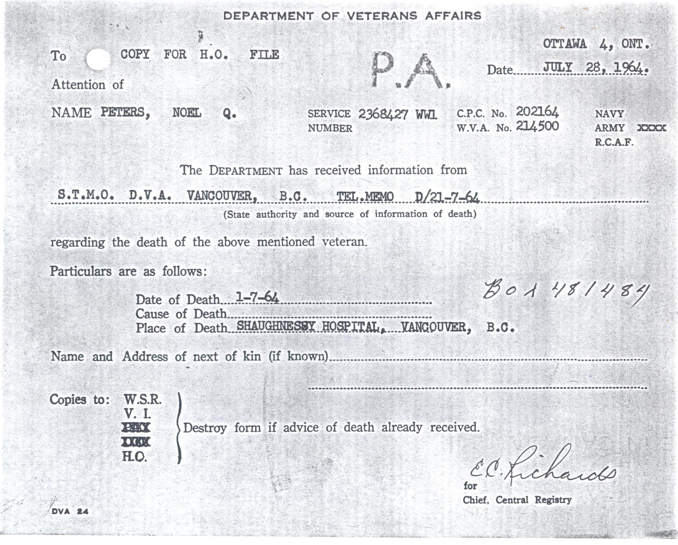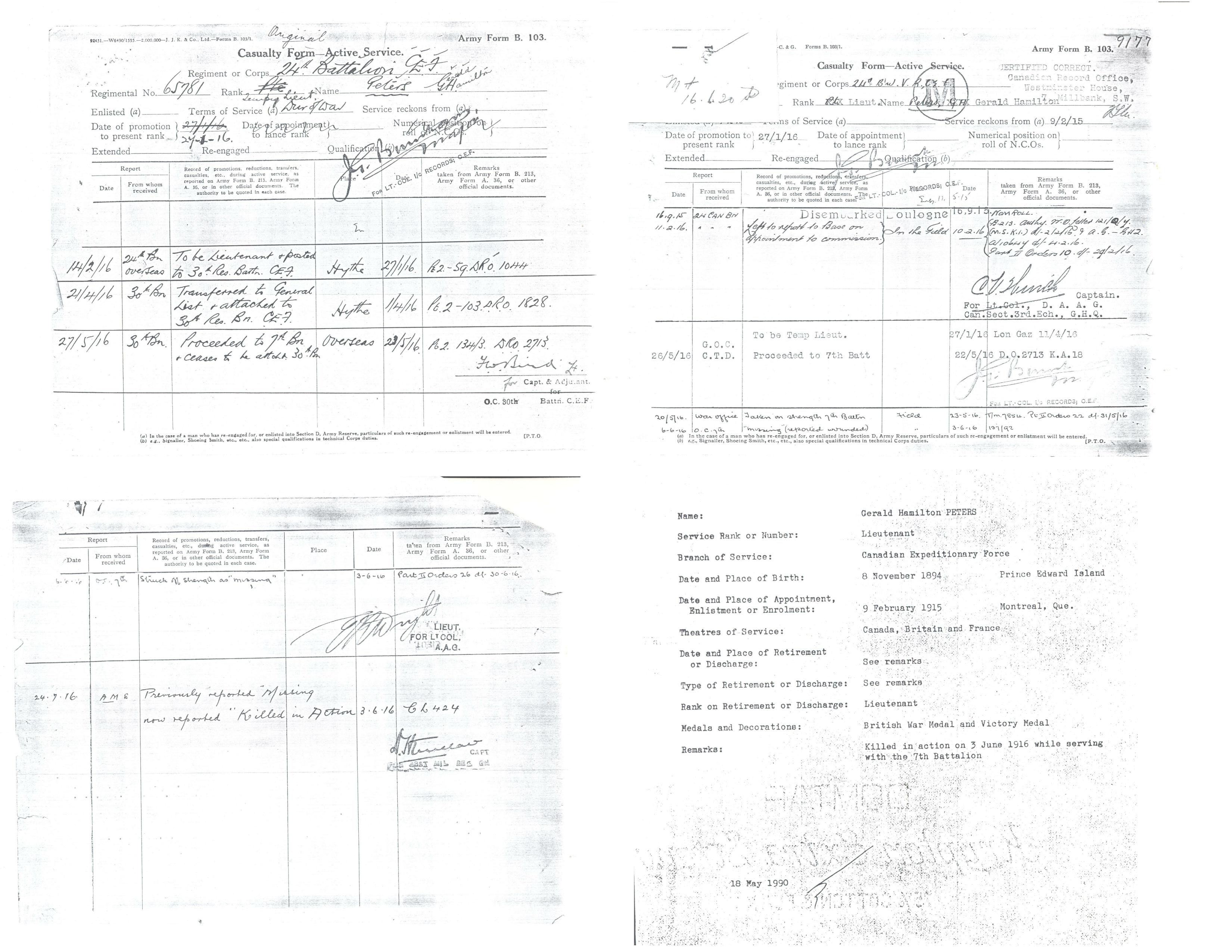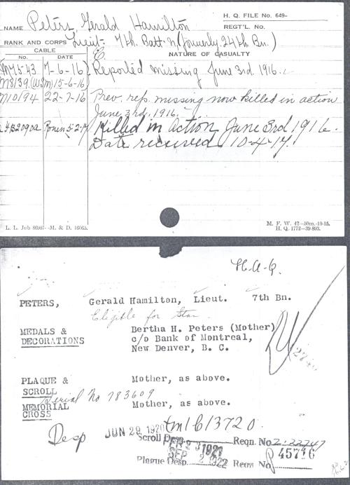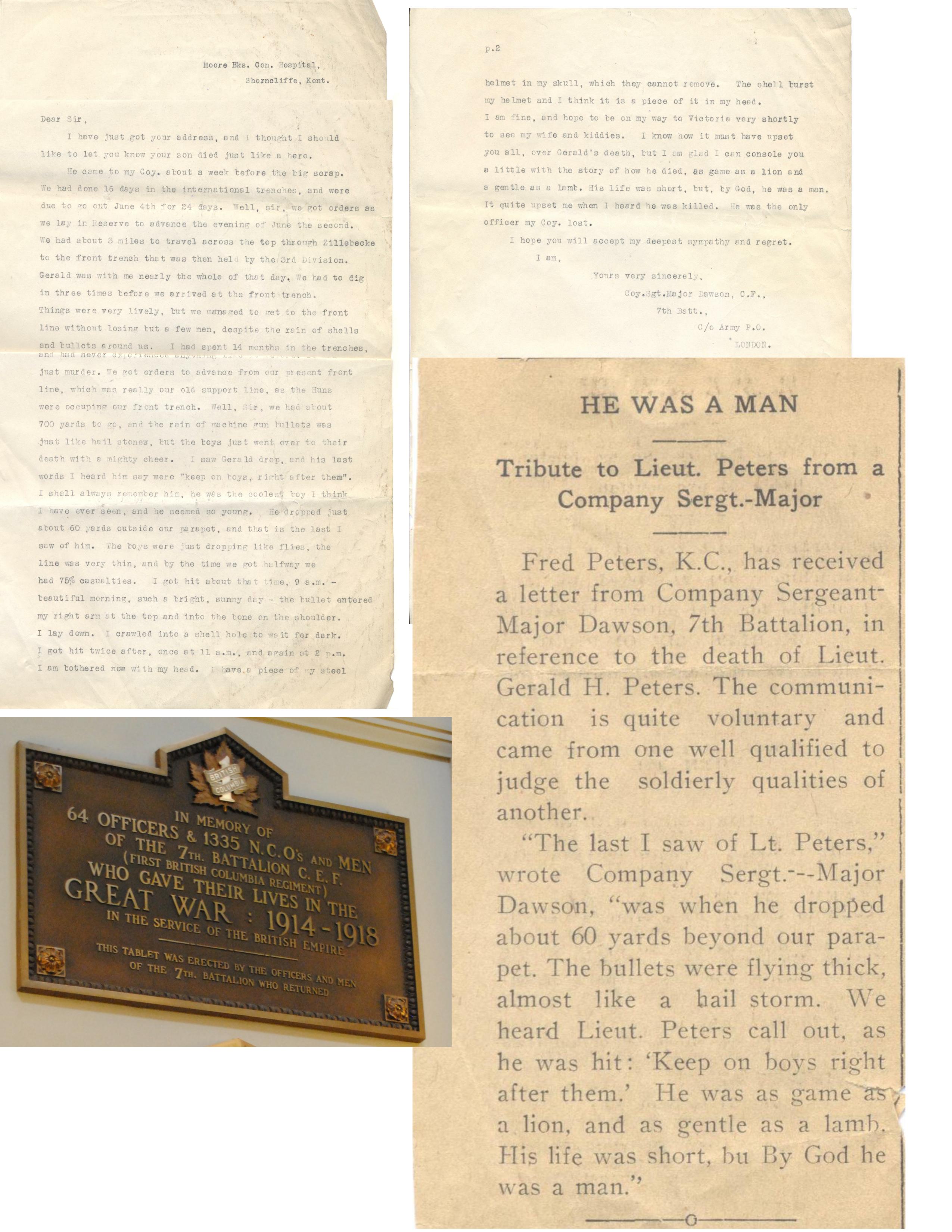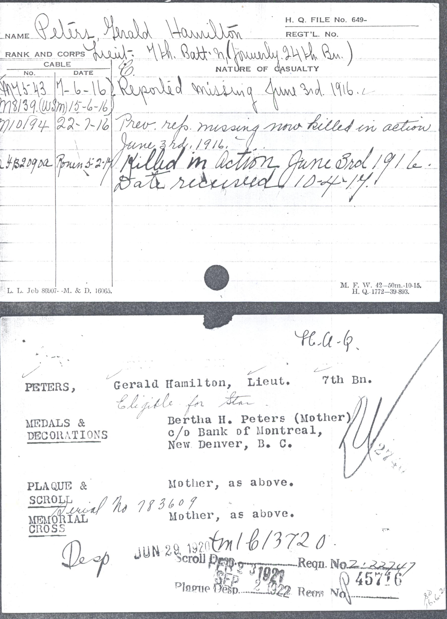 6 – William Hamilton “Willie” Abbott was Jack`s cousin. His mother was Mary Stukeley Hamilton Gray, sister of Jack`s mother Bertha Gray. His father was William Abbott, son of the Canadian Prime Minister John Abbott. The Abbott home in Montreal was a regular stop for members of the Peters family travelling by rail to or from England. Willie, a civil engineer, survived the war. He was interviewed by the Montreal Gazette in 1943 after his cousin Fritz Peters received the Victoria Cross. Willie was a greatuncle of the Canadian actor Christopher Plummer.