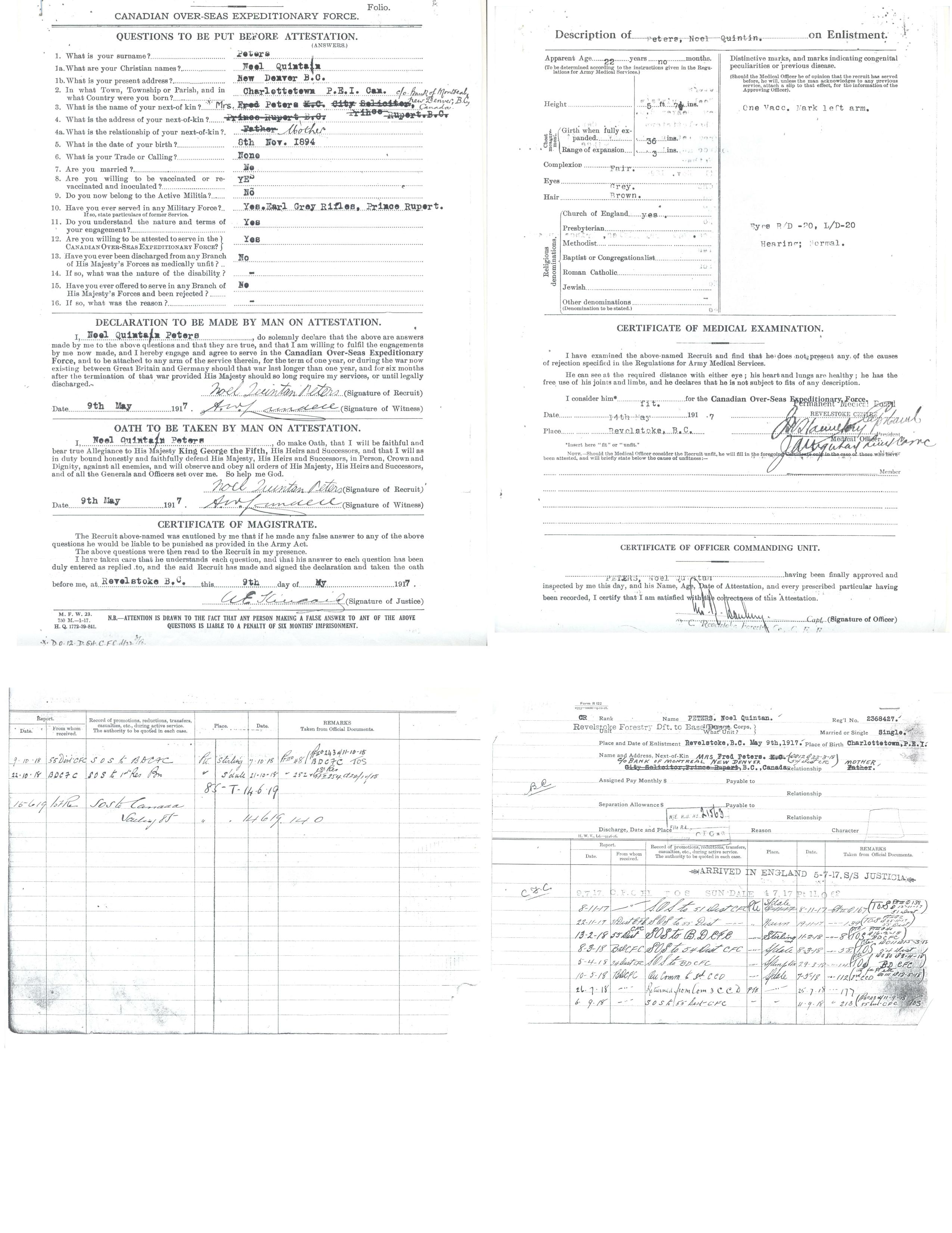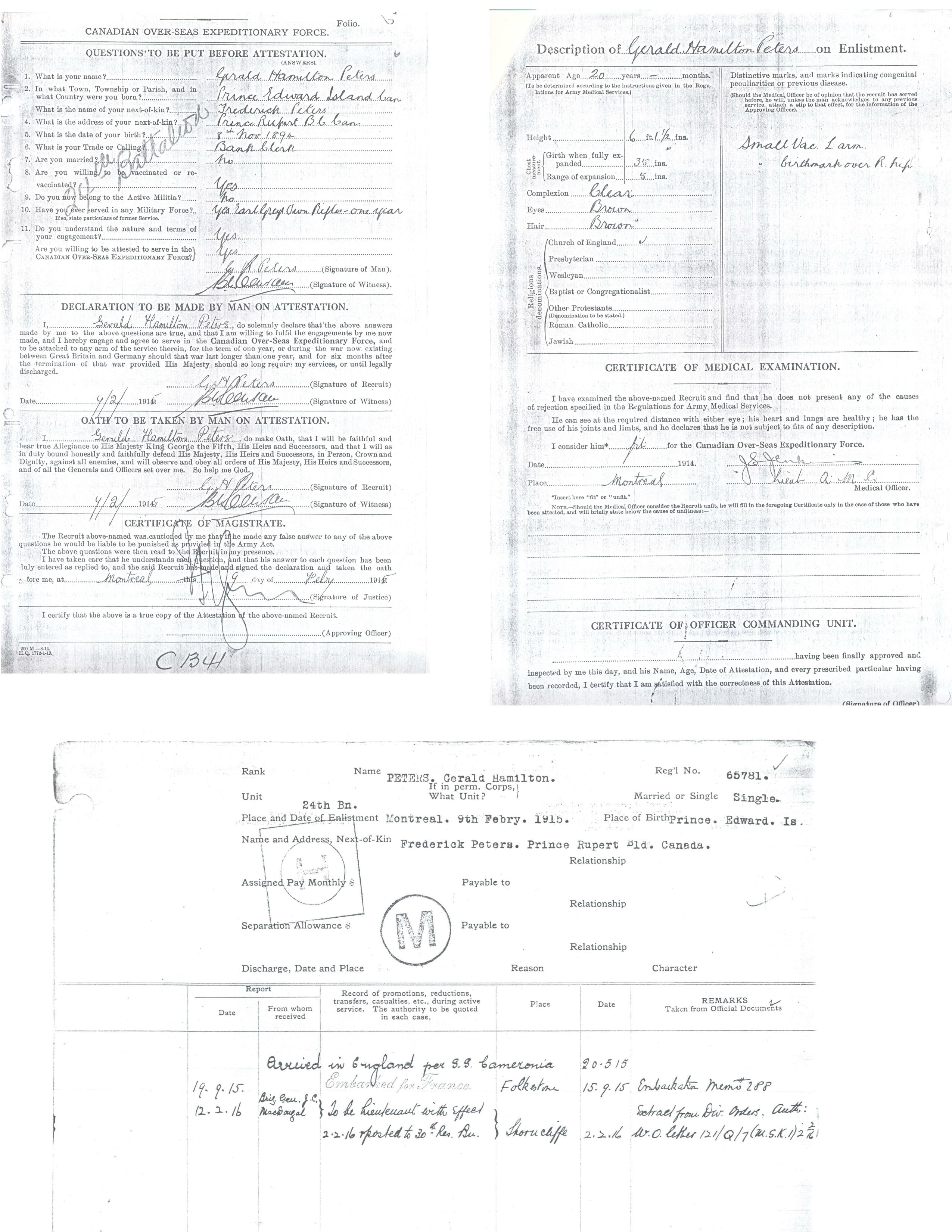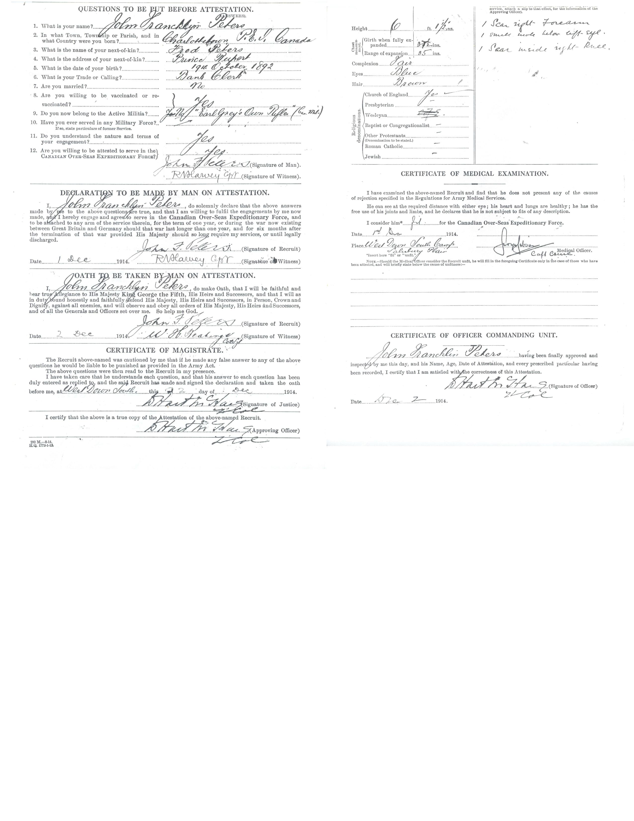 1 Captain Rupert (aka Robert) Valentine Harvey (1872-1915) was born in Liverpool and taught school there before moving to Canada in 1899 to teach at Queen’s School in Vancouver. In 1901 he took over as headmaster and then in 1908 merged his school with UniversitySchoolin Victoriathat had been founded two years before by Rev. W.W. Bolton (who had taught Fritz Peters at his school on Belcher Avenuein Victoriabefore Fritz went to Englandfor preparatory school in 1900) and J.C. Barnicle. Harveybecame Warden of the UniversitySchool(now known as St. Michael’s UniversitySchool, the largest residential school in B.C.). In a 1917 letter to his father, Fritz Peters mentioned meeting Harvey several years earlier and discussing schoolmastering with him, which Fritz was considering as a career at the time. Harvey was a strong believer in cadet corps and scouting, but he didn’t serve in the Boer War. In 1914 he left with his regiment, the 7th Battalion, as Captain for overseas duty. On April 24, 1915 in the Second Battle of Ypres he and the No. 3 Company he commanded were surrounded by Germans in their full-scale assault on Canadian forces. Harvey was seriously wounded but refused medical treatment until injured men in his company were taken care of. He was taken prisoner, and died in a prison hospital in Germany on May 8, 1915.[i] Captain Harvey’s signature is on Jack Peters’ attestation papers.