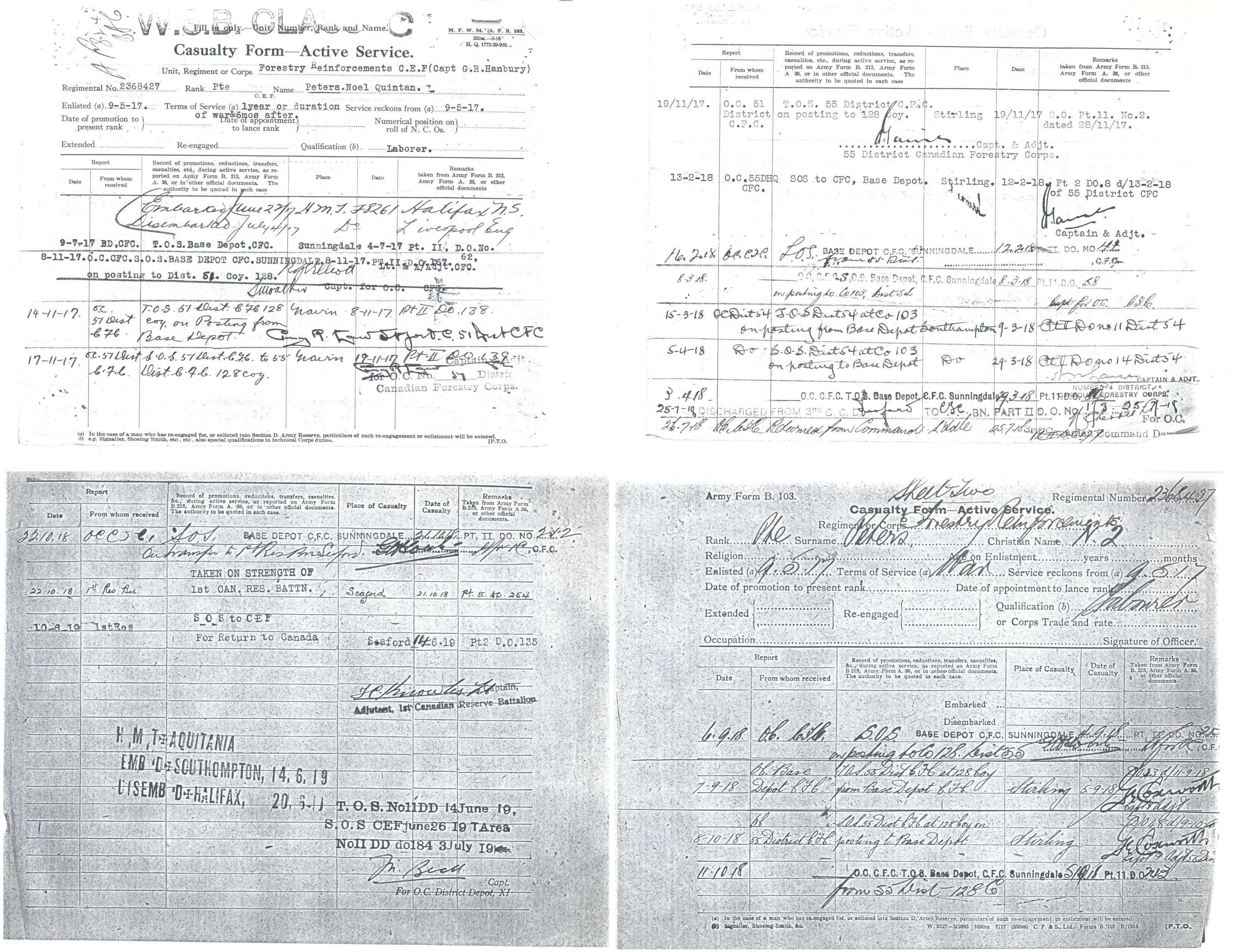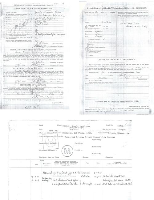 At the outbreak of the Great War in 1914 he and brothers Gerald and Noel rushed to enlist, but only Jack was accepted for war service. Like Jack, Gerald was tall at 6 foot, one and a half inches, but Gerald`s chest measurement was below the army standard, so he was rejected. Gerald later travelled to Montreal to enlist there, and this time passed the physical exam. Noel was rejected because of a slight, but noticeable, mental disability, and was not accepted for military service until he was allowed to join the Canadian Forestry Corps in Britain in May 1917.