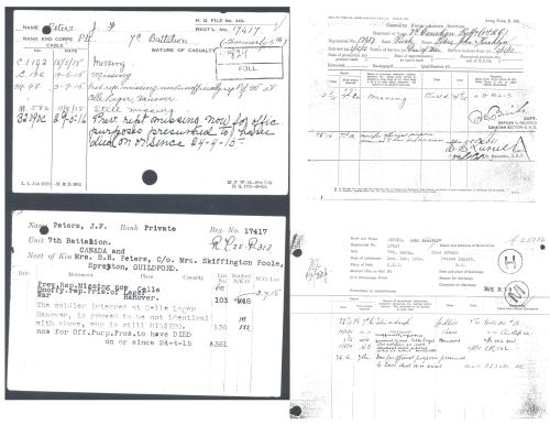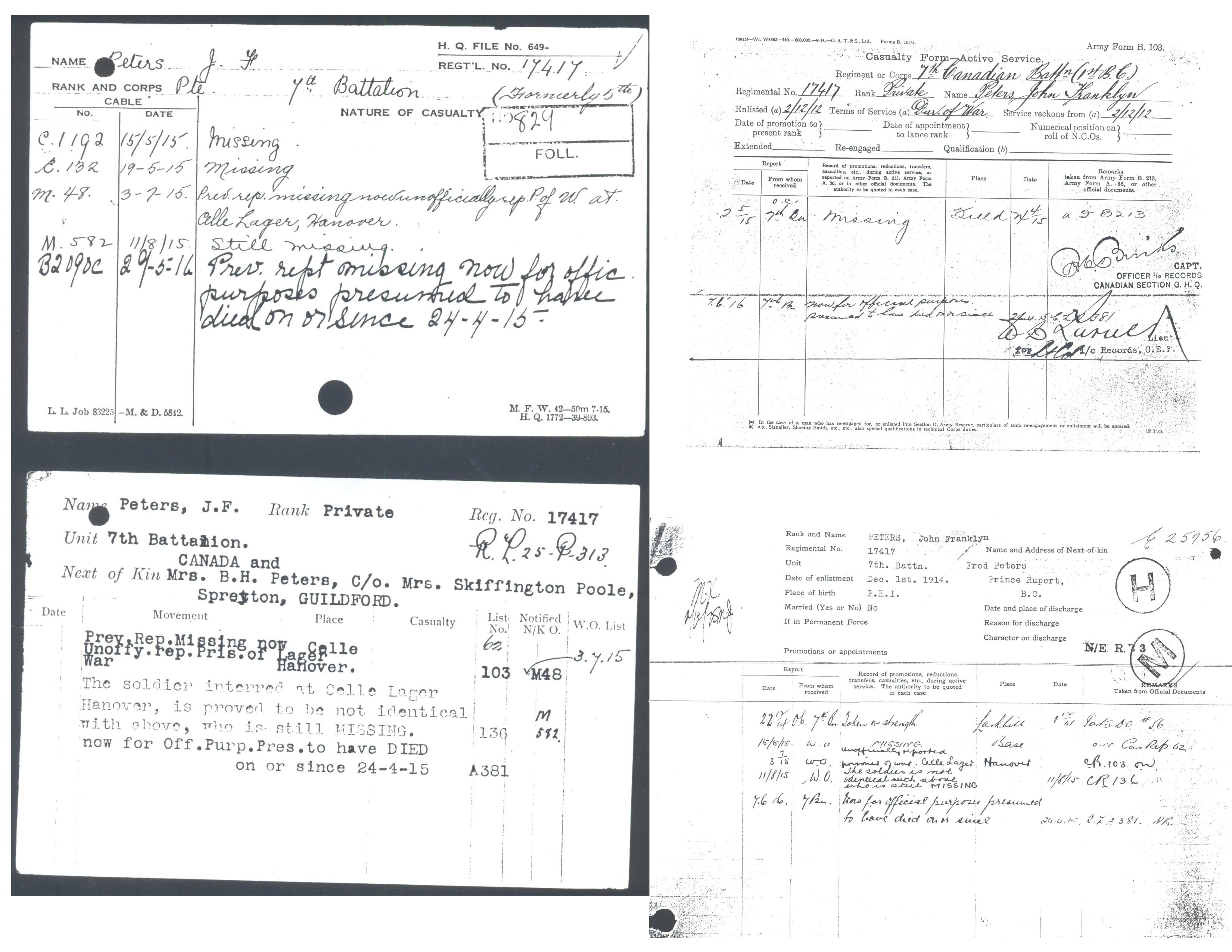 There were hundreds of Canadian prisoners taken in the shifting front that day, and for a period the military authorities thought Jack might be among prisoners in Belgium or Germany. Dozens of soldiers of the 7th Battalion were taken prisoner after the Germans surrounded and captured the small village of St. Julien. The Peters family felt 100% sure that Jack was safe as a prisoner, largely because Fred`s cousin Helen Francklyn in Bristol said a friend of hers in Switzerland found out that Jack was at the Celle Lager prison in Hanover. However, the Red Cross found that the prisoner in question in Hanover was in fact someone else, so on May 29, 1916 Jack was officially presumed to have died “on or after April 24, 1915”. Of 900 men and 24 officers in Jack’s battalion, 580 men and 18 officers were casualties in the 100 hours of frantic action that followed the first gas attack. Four Victoria Crosses were awarded to Canadians in the battle, including Lieutenant Edward Bellew of Jack’s 7th battalion. John McCrae, a surgeon in charge of a field hospital, wrote his famous poem “In Flanders Fields” on May 3, 1915, inspired by the death of a close friend in the same battle in which Jack died.