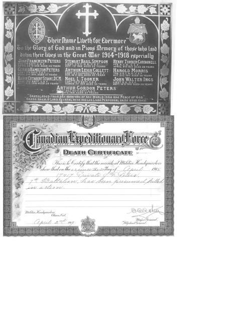 After being assured for so long that Jack was safe, his mother Bertha refused to believe he had died. She did not accept his death until the war was over, and no further information on Jack had emerged. She grieved much more for son Gerald, who died in the Battle of Mount Sorrel in June 1916. Gerald was her favourite child, and they were exceptionally close. A memorial plaque (image below) with the names of Jack Peters, Gerald Peters, their cousin Arthur Gordon Peters, and seven other Charlottetown boys who died in the war was installed at St. Paul`s Anglican Church in Charlottetown. The names of Jack and Gerald Peters are also listed on the Menin Gate memorial in Ypres that includes the names of thousands of Allied soldiers who died at Ypres with no identified remains.