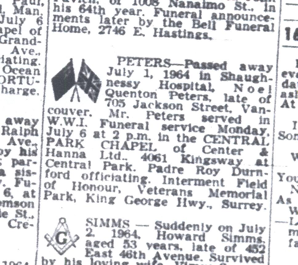 However, Jack would be the first of three Peters brothers to die in the world wars of the 20th century. He was killed on Saturday, April 24, 1915 in the 2nd Battle of Ypres when Canadian troops made a courageous stand against a massive German attack that used poison gas for the first time on the Western Front.