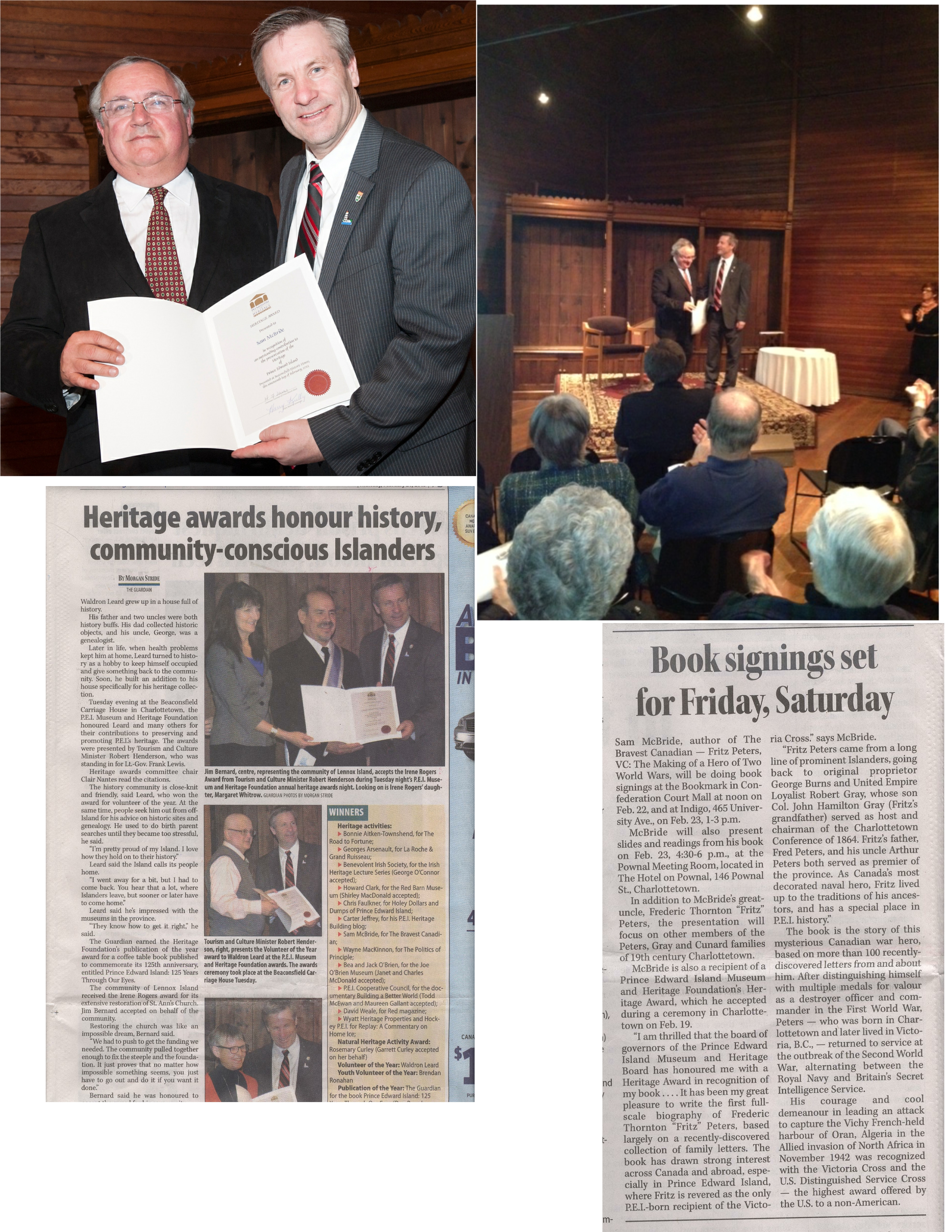 On Tuesday, February 19, 2013, Sam McBride, author of “The Bravest Canadian — Fritz Peters, VC: The Making of a Hero of Two World Wars”, received a Heritage Award at the annual awards night of the Prince Edward Island Museum and Heritage Authority.