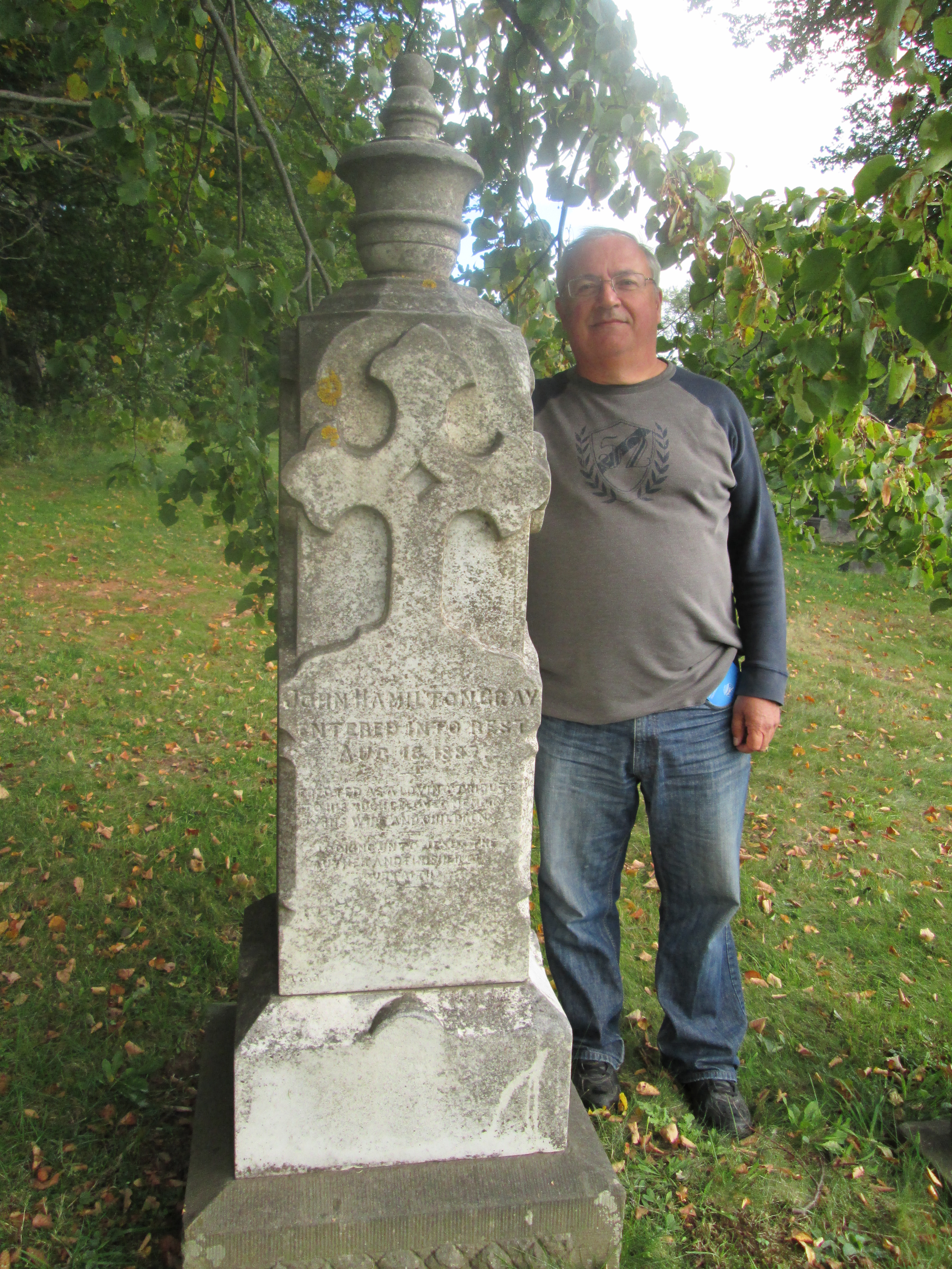 The author Sam McBride beside the tombstone of his great-great-grandfather John Hamilton Gray of P.E.I. in October 2013