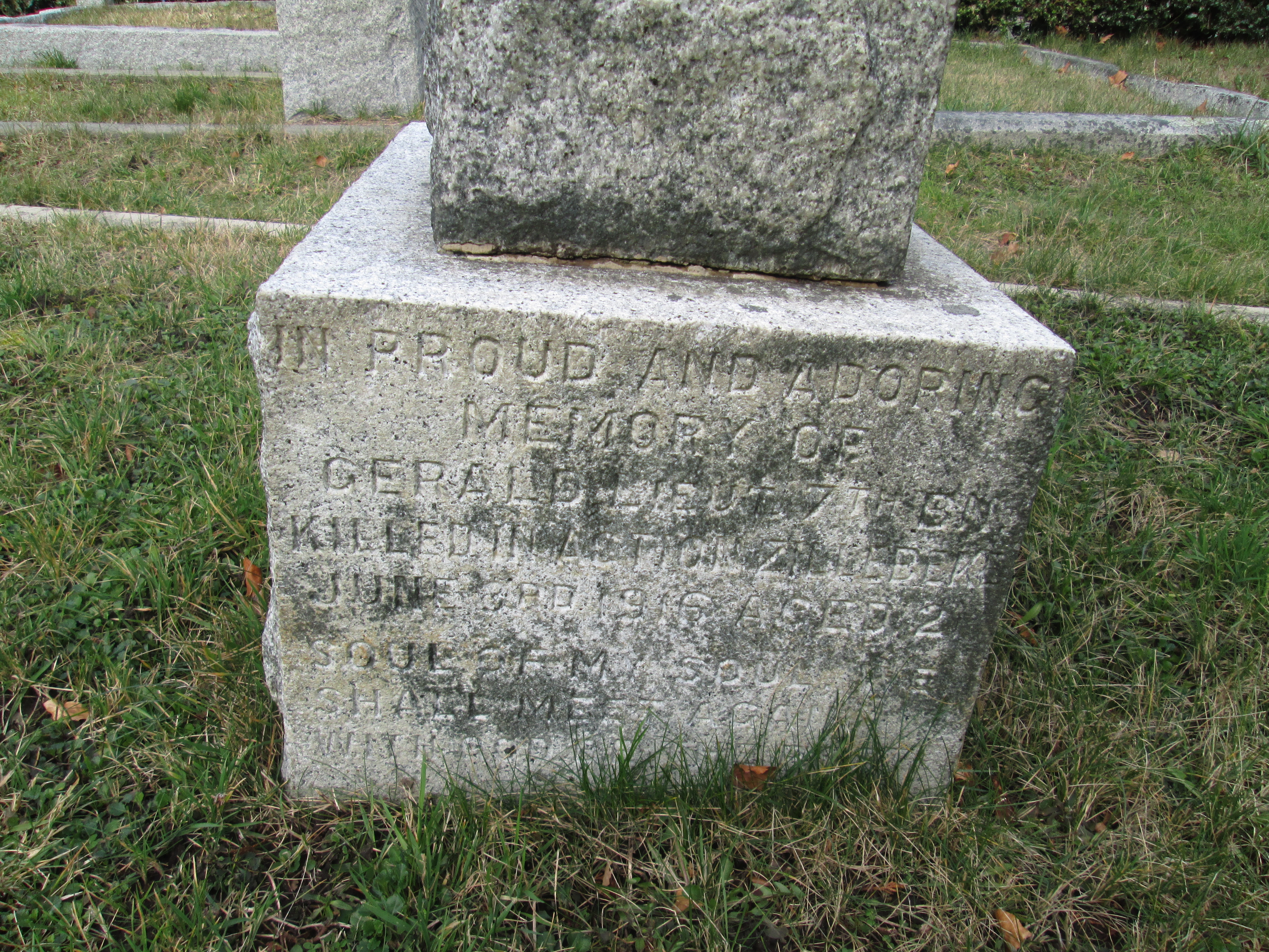 Text on a side of the base of the Frederick Peters tombstone in honour of his son Gerald who died in WW1. The other side of the stone has a tribute to son Jack Peters who also died in action in WW1. Both boys were among the dead at Ypres with no graves and no identified remains.