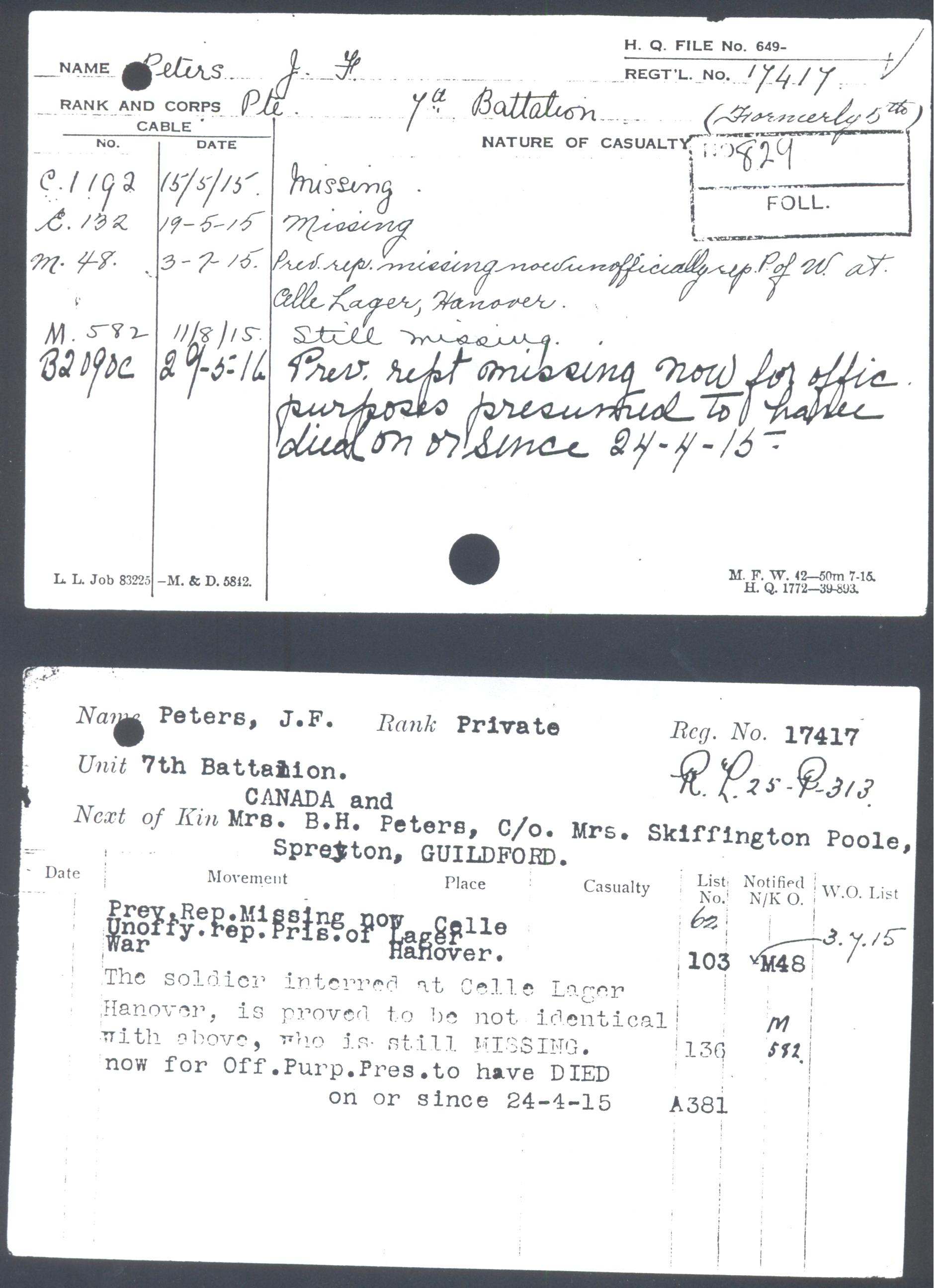 There were hundreds of Canadian prisoners taken in the shifting front that day, and for a period the military authorities thought Jack might be among prisoners in Belgium or Germany. Dozens of soldiers of the 7th Battalion were taken prisoner after the Germans surrounded and captured the small village of St. Julien. The Peters family felt 100% sure that Jack was safe as a prisoner, largely because Fred`s cousin Helen Francklyn in Bristol said a friend of hers in Switzerland found out that Jack was at the Celle Lager prison in Hanover. However, the Red Cross found that the prisoner in question in Hanover was in fact someone else, so on May 29, 1916 Jack was officially presumed to have died “on or after April 24, 1915”. Of 900 men and 24 officers in Jack’s battalion, 580 men and 18 officers were casualties in the 100 hours of frantic action that followed the first gas attack. Four Victoria Crosses were awarded to Canadians in the battle, including Lieutenant Edward Bellew of Jack’s 7th battalion. John McCrae, a surgeon in charge of a field hospital, wrote his famous poem “In Flanders Fields” on May 3, 1915, inspired by the death of a close friend in the same battle in which Jack died.