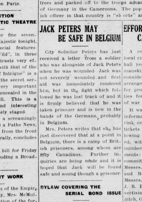 However, Jack would be the first of three Peters brothers to die in the world wars of the 20th century. He was killed on Saturday, April 24, 1915 in the 2nd Battle of Ypres when Canadian troops made a courageous stand against a massive German attack that used poison gas for the first time on the Western Front.