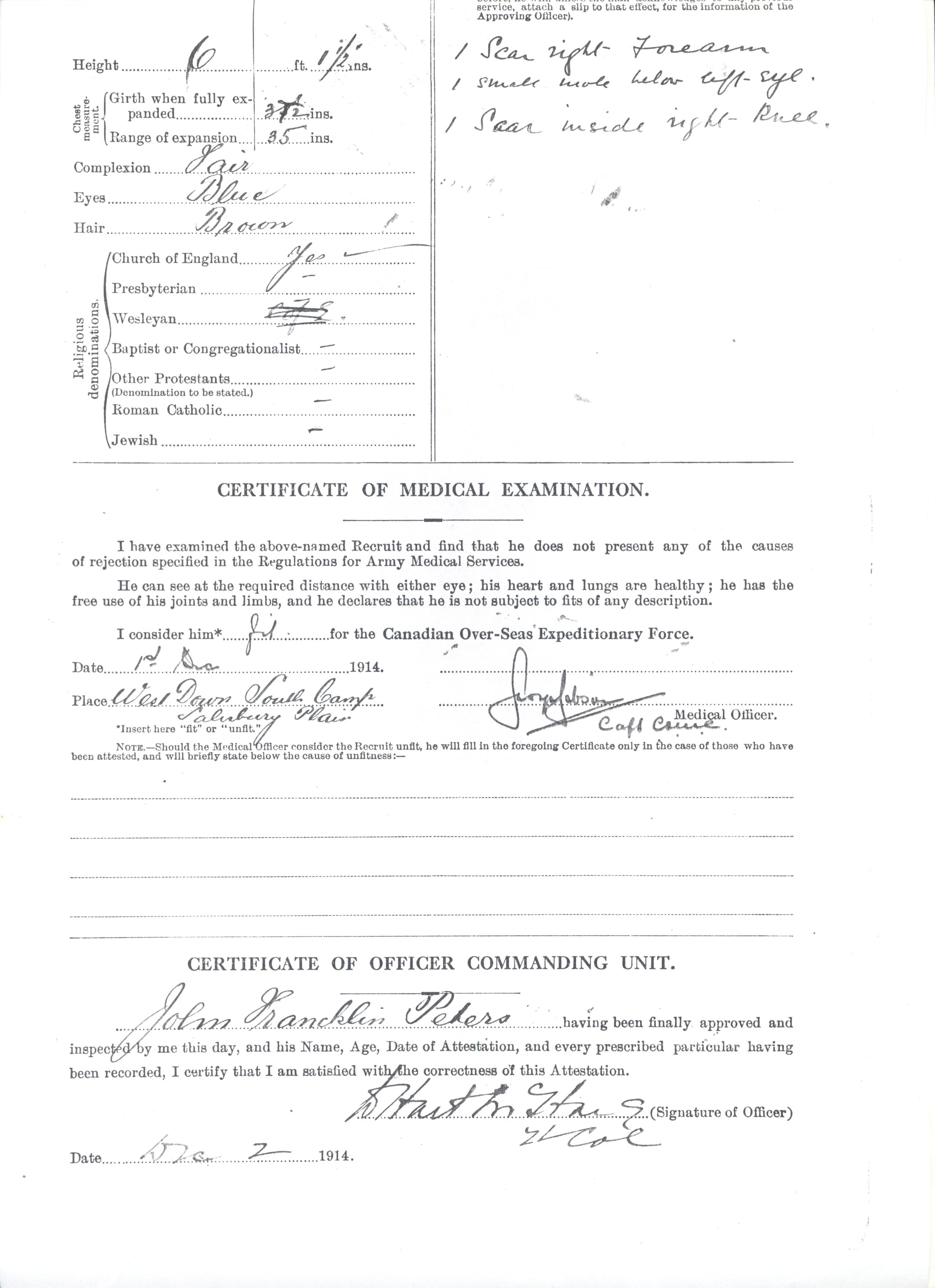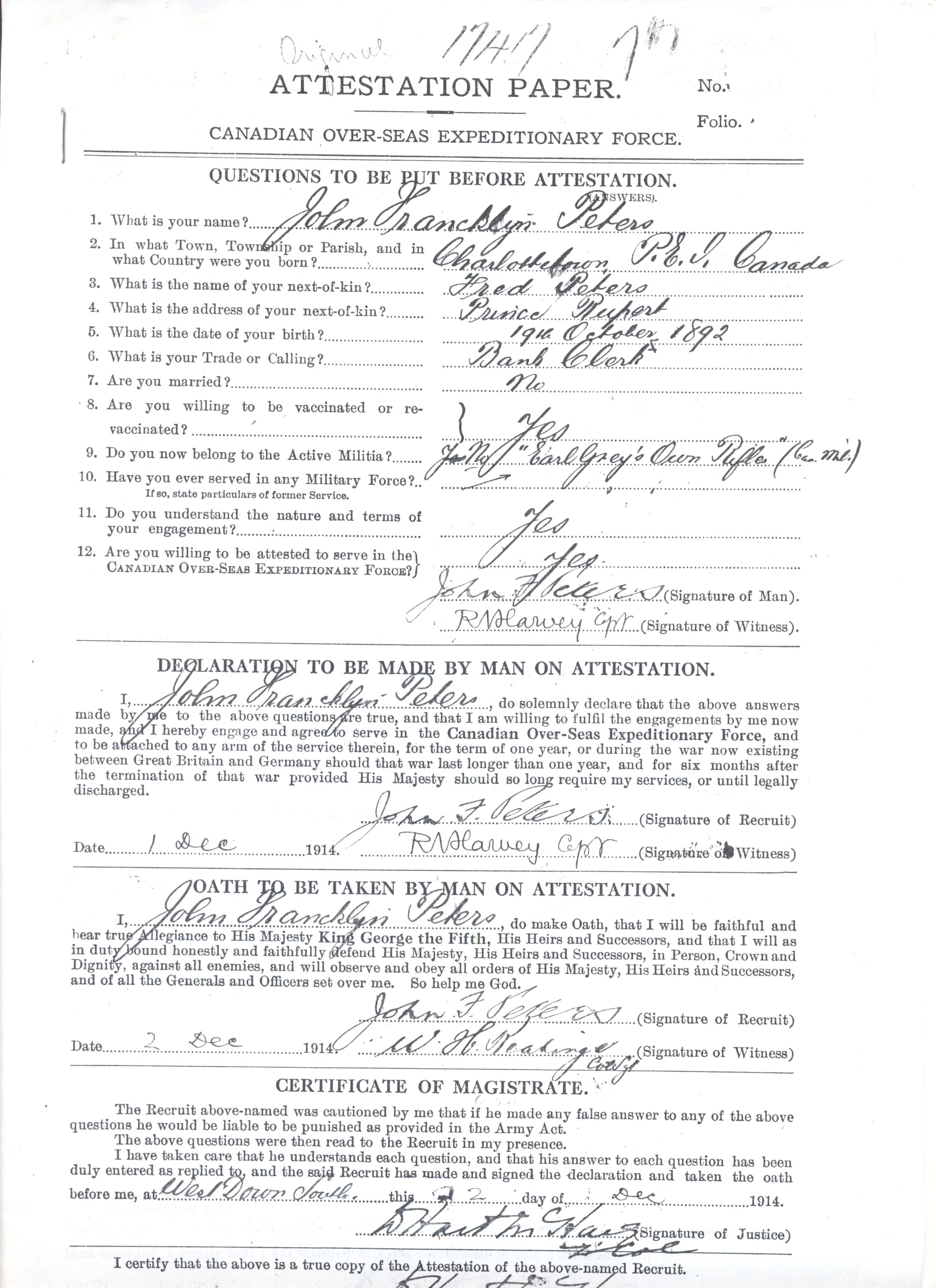 Attestation papers signed by Lt. Col. William Hart-McHarg, commanding officer of the 7th B.C. Battalion. Both he and Jack died April 24, 1915 in the Second Battle of Ypres.
