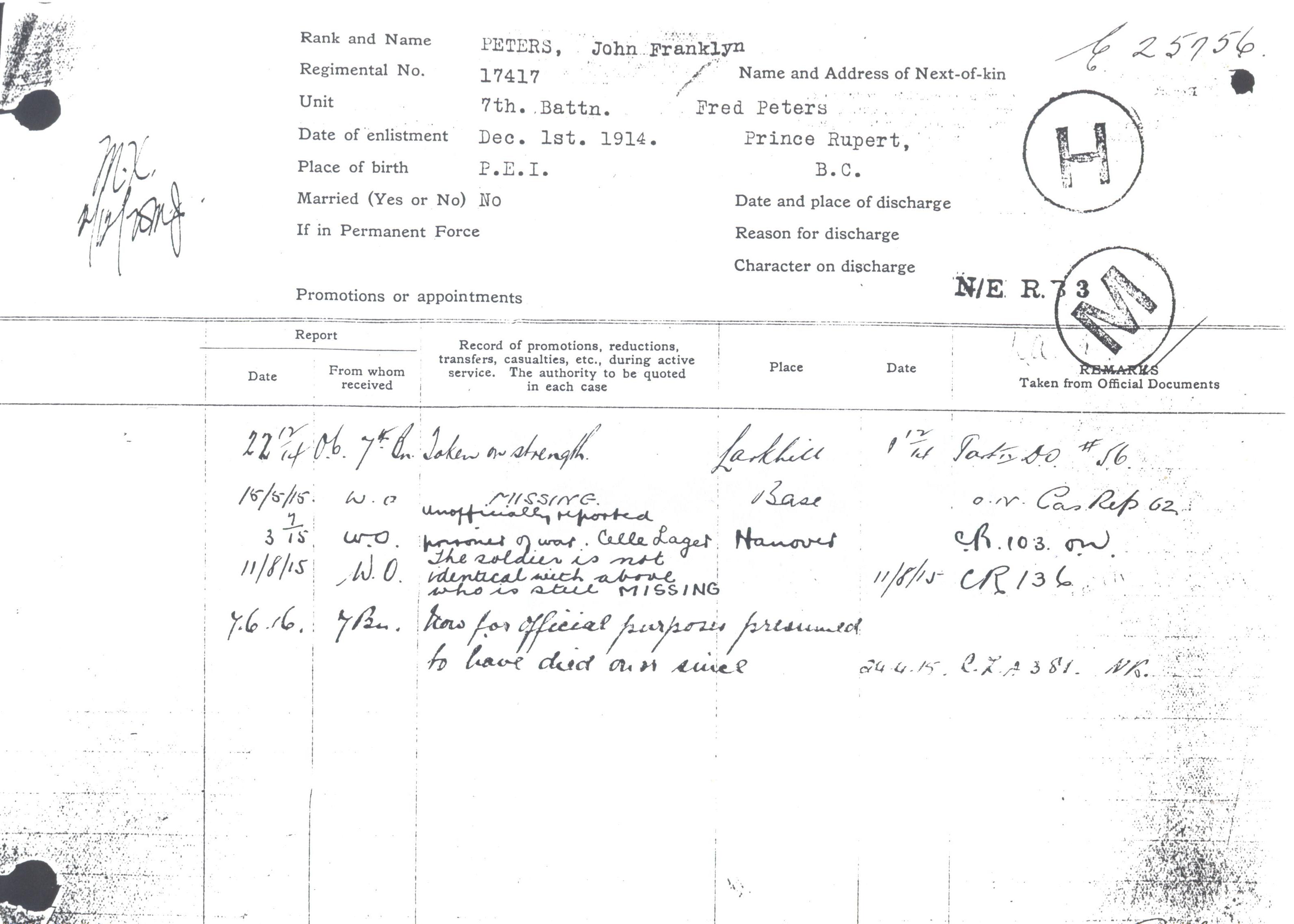 As a large number of Jack’s comrades in the 7th British Columbia Battalion were taken prisoner that day, Jack’s family hoped he was alive and safe as a prisoner while he continued to be listed as “missing”. Rumours that he was being held at the Celle Lager camp in Hanover proved to be wrong when the Red Cross reported in May 1916 that Jack was no among the POW’s.