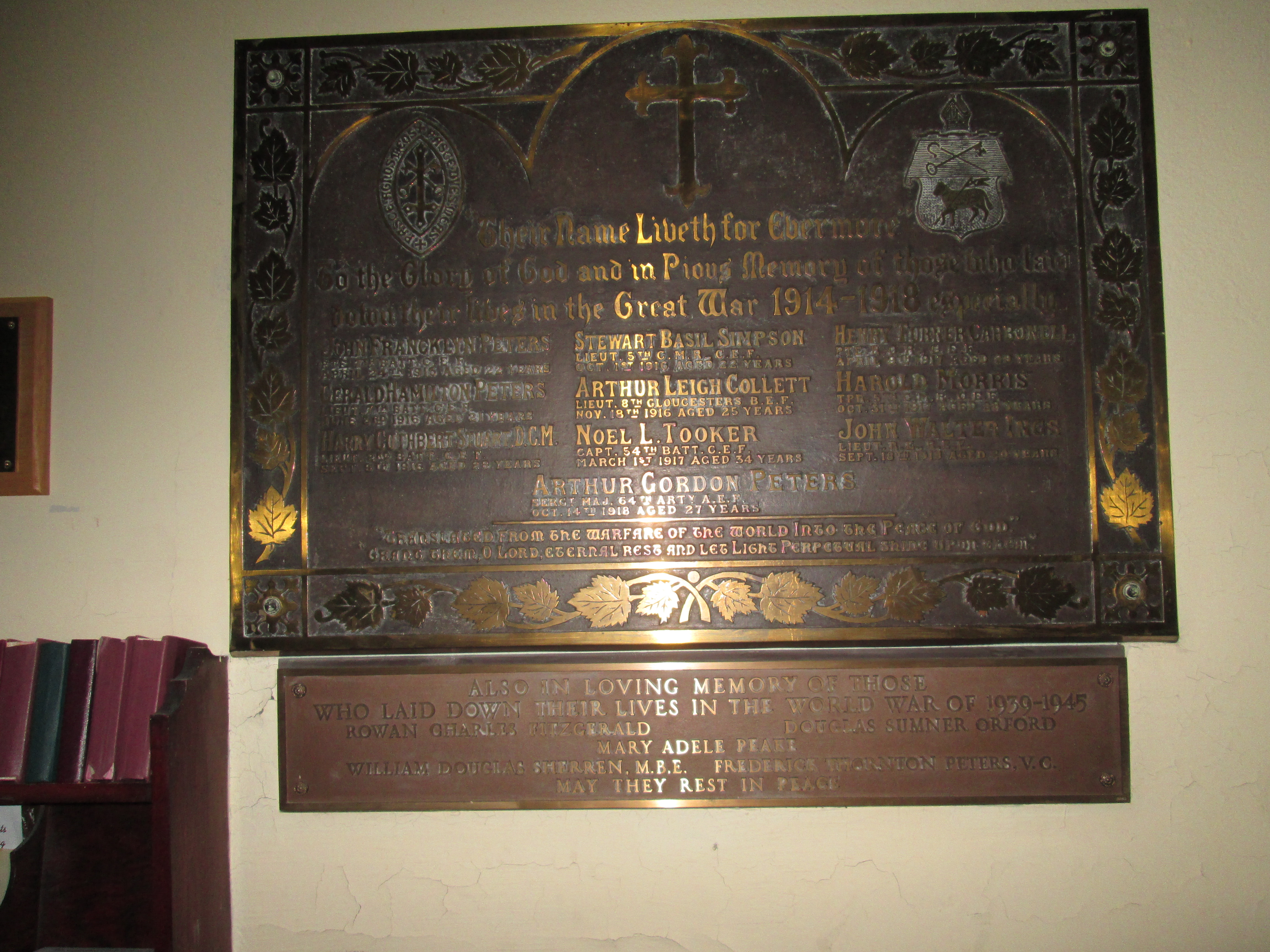 Colour photo of the above plaque taken in September 2014. Note the addition of a newer plaque below with names of Fritz Peter and other PEI-born boys who died in Second World War. .