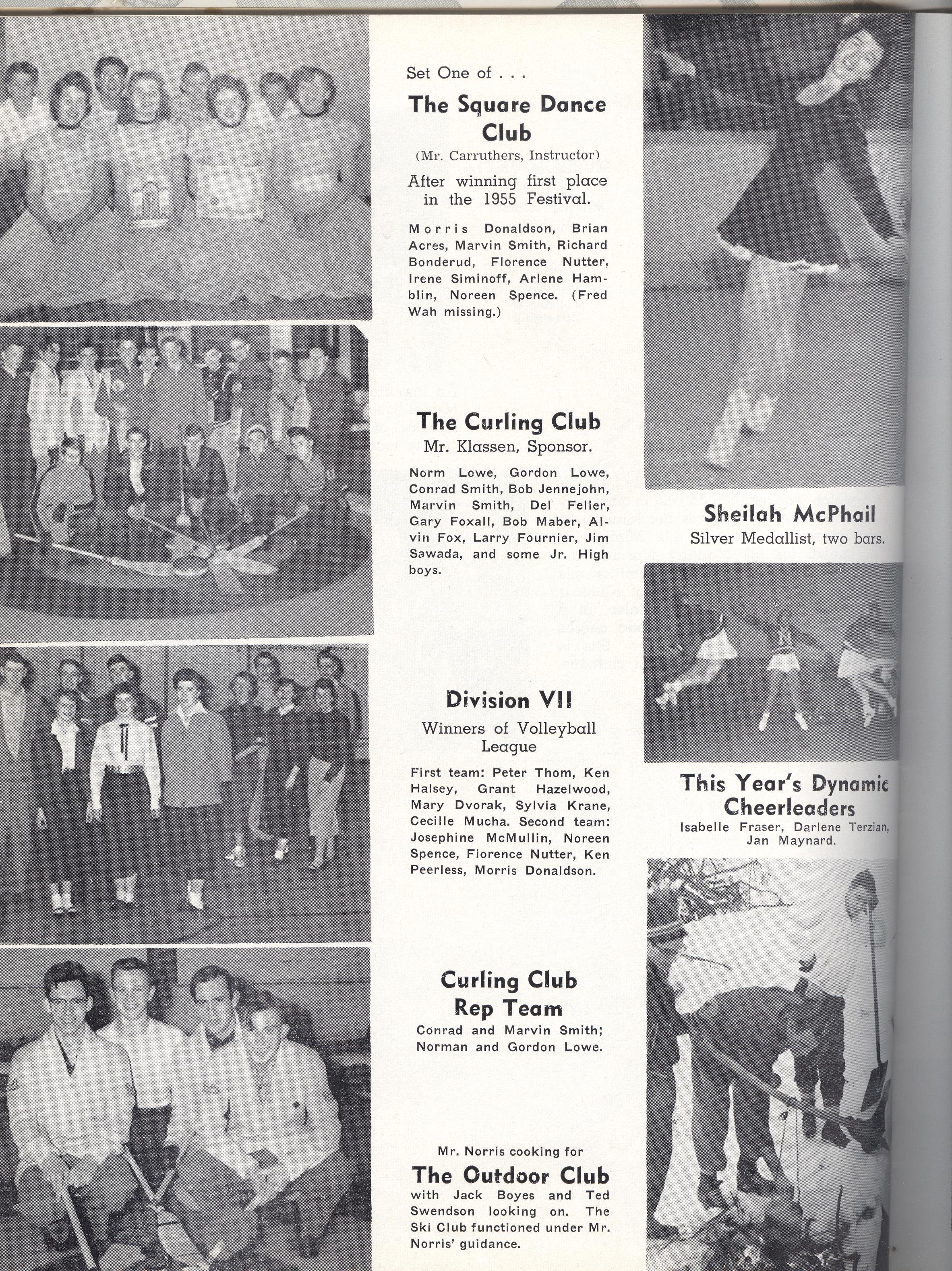 Photos of Sheilah McPhail are in the special 1956 high school grad publication commemorating the arrival of the new L.V. Rogers High School in Nelson. ABOVE, she is top right in the right-side group of photos. BELOW, Sheilah figure skating. In addition to being a champion skater, she was an accomplished singer and pianist.