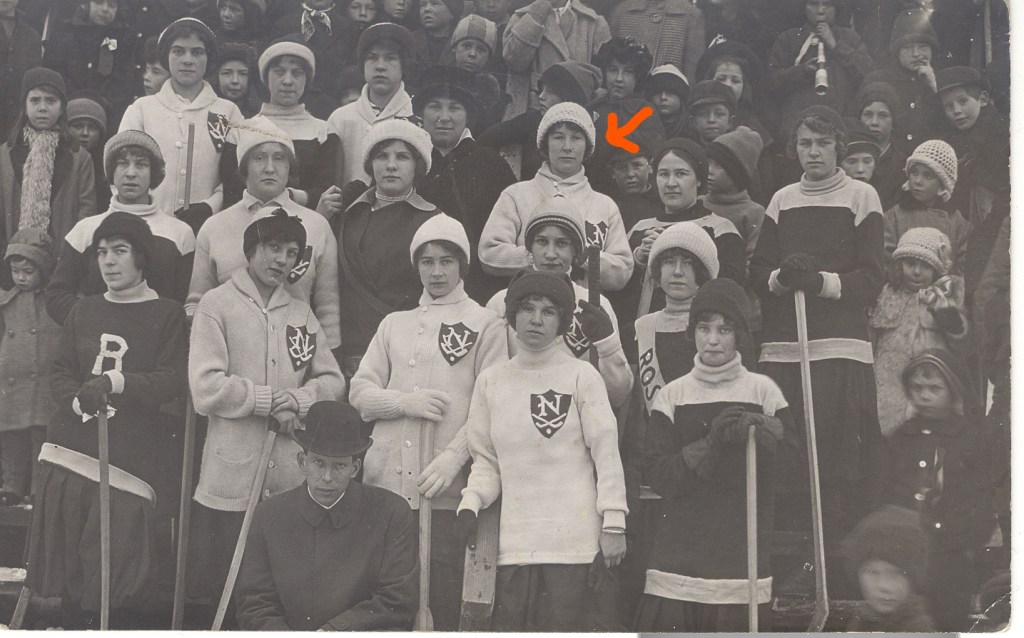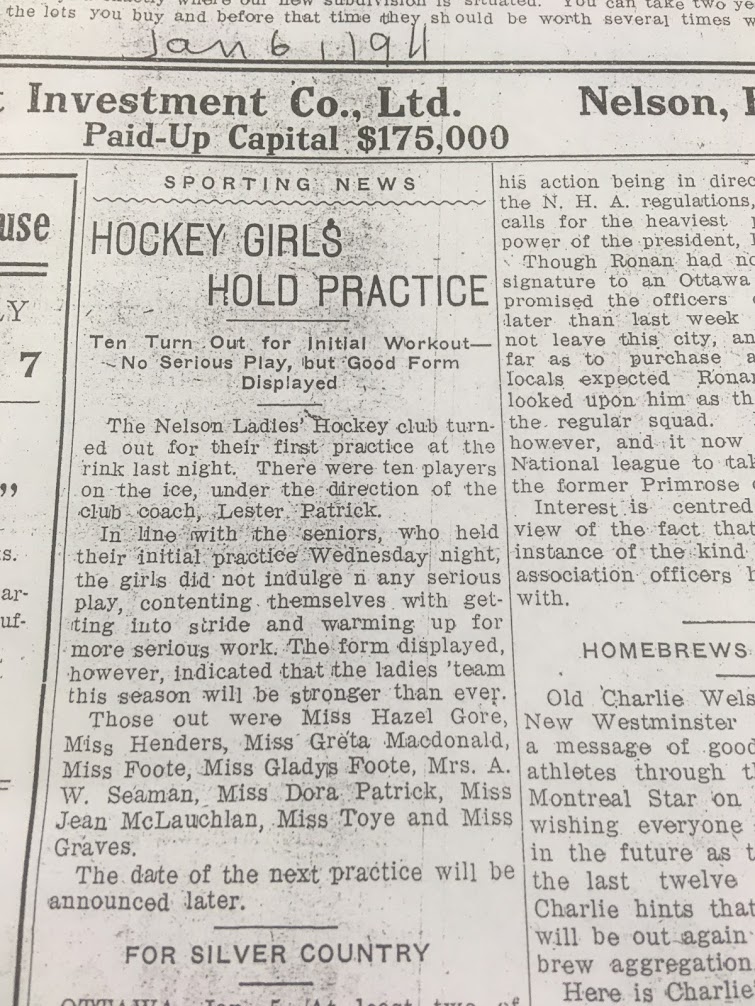 I remember hearing that Aunt Glad was an excellent ice skater in her youth, but until recently I had no idea that in her late teens she played ladies ice hockey in Nelson against other ladies teams in the city, as well as in competition with teams from Rossland and other communities in the isolated, mountainous, mining region where ladies ice hockey competition was ahead of its time in the early 1900s. The mining boom towns of Sandon and Rossland had an advantage over Nelson teams in that era because their natural ice would stay well-frozen through almost all of the winter, while Nelson’s ice would be subject to bouts of melting due to warm winter trends which were otherwise welcomed by 1930s. Residents were so happy to have the capability for artificial ice despite the weather outside that they established the Nelson Midsummer Curling Bonspiel which was a popular annual tradition for the rest of the 20th century.