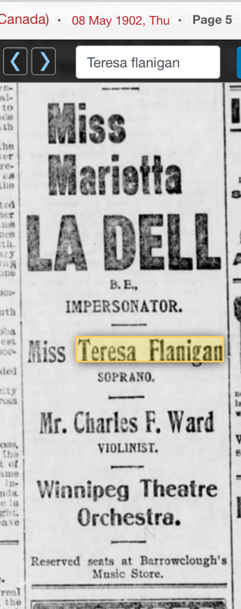 The Daily News writer suggests that the performers made a big mistake in not advertising their event in the paper, resulting in the event being cancelled due to lack of attendance. In another search, I found an ad promoting the pair in a concert with others in the Winnipeg Tribune of May 8, 1902, posted here.