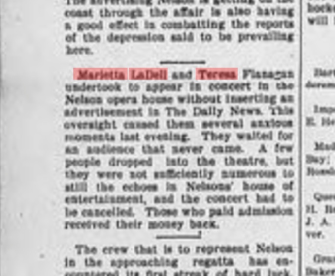 Perhaps they missed the deadline for ads in the Nelson paper, or just could not afford it, and thought they could attract enough people by putting a banner on a streetcar that many would see and spread word to others. Online searching shows that Ladell was an elocutionist and impersonator, while Flanigan was a soprano singer. Based on news articles, Ladell was on the road with different partners for many years, performing in small towns in Canada and the U.S.