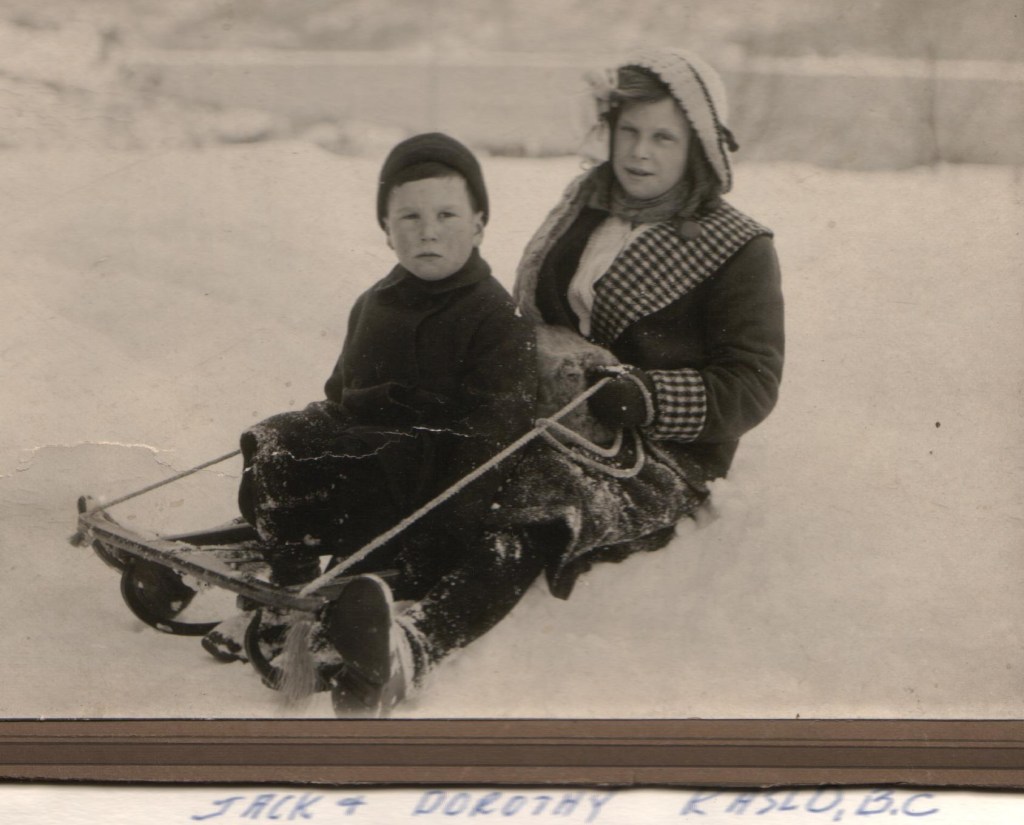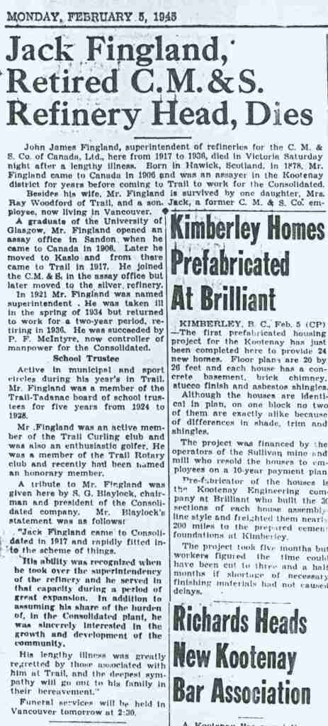 The information I have from family files is that Jack’s father John James Fingland (who was also known as Jack, as well as JJ, born in Hawick, Roxburgh, Scotland in 1878 and died in Trail, BC in 1945) came from Scotland with wife Ethel Andrew (1880-1962) and young daughter Dorothy (born in Spain where her father was working in July 1902) to Sandon in 1906, where he established an assaying business. The family was in Sandon for a short while before moving to Kaslo, and then to Trail in 1917 where JJ Fingland worked for the Consolidated Mining and Smelting Company (abbreviated as CM&S, later known as Cominco and now Teck), rising in the company to be superintendent of refineries.
