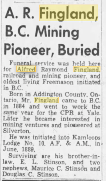 From my own visits to the Fingland Cabin as well as online searches, the cabin got its name from longtime resident Alfred “Fred” Raymond Fingland, who was born in Ontario in 1865 and died in Vancouver in 1952. Fred Fingland’s father William Fingland (1832-1906) was born in Ontario, son of George Fingland, who was born in the small community of Dumfries in southwest Scotland in about 1800.