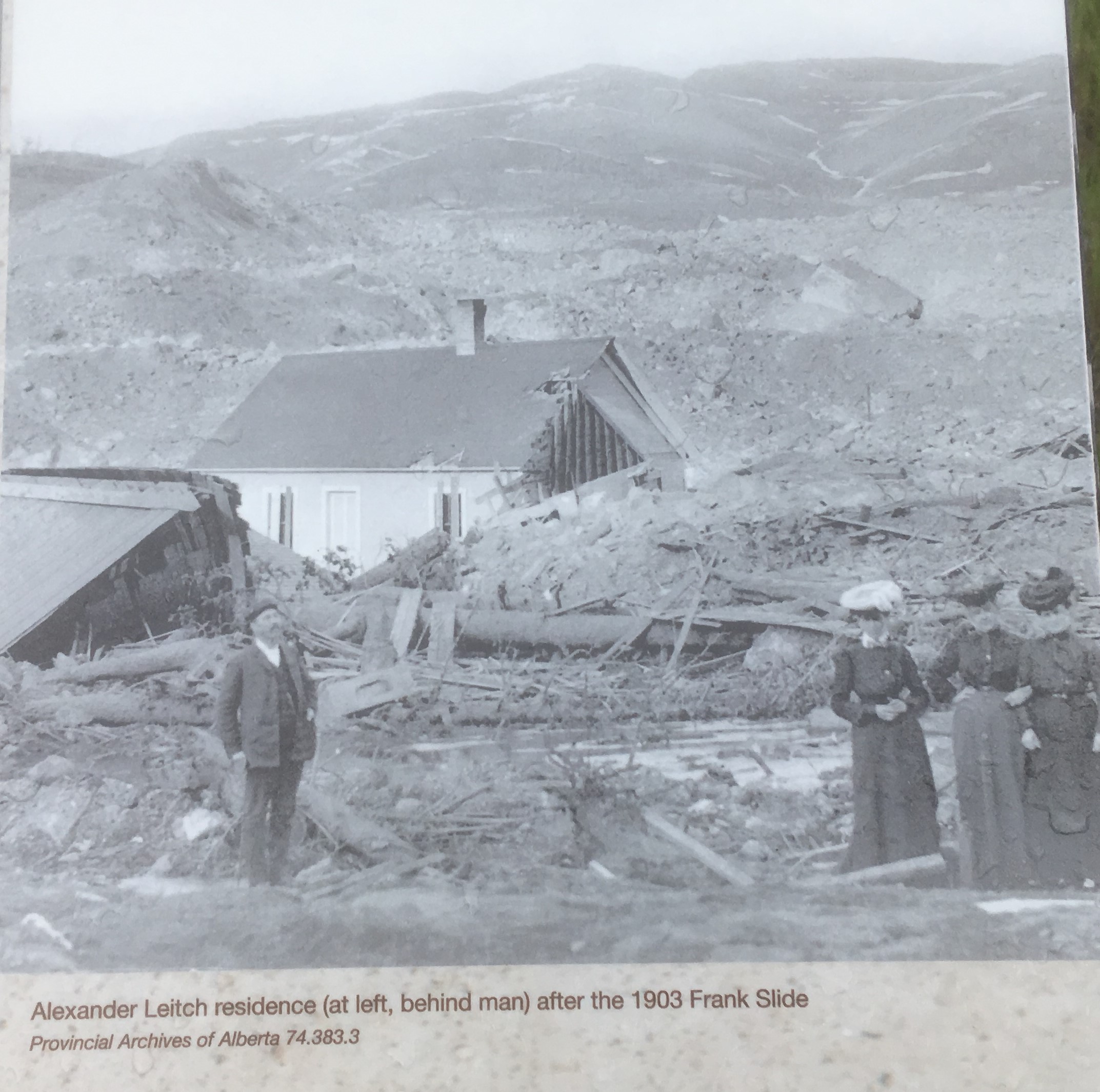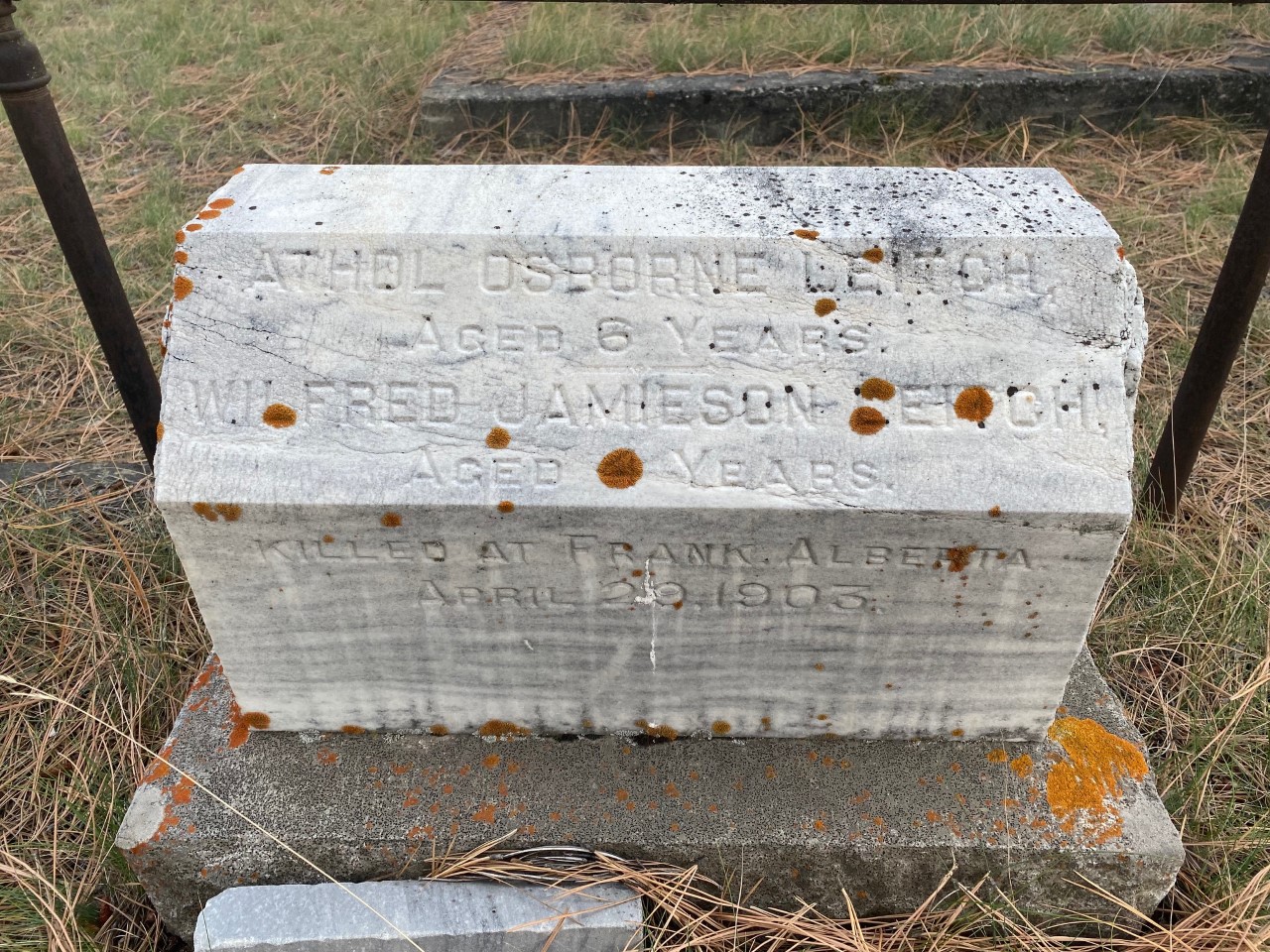 The infamous Frank Slide in the Crowsnest Pass in the early morning of Wednesday, April 29, 1903 smashed into the Leitch home, immediately killing the parents Alexander and Rosemary Leitch, and their sons John Alexander Leitch (born in 1890), Allan Roy Leitch (born in 1894), Athol Osbourne Leitch (born in 1896) and Wilfred Jamieson Leitch (born in 1898). The three daughters — Jessie, May and Marion — were all extremely fortunate to survive the slide.