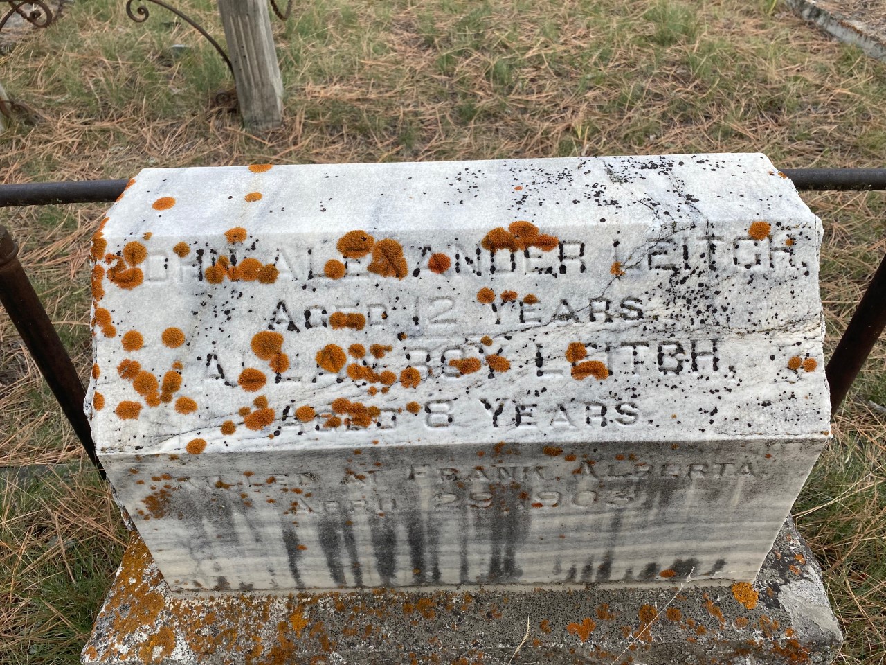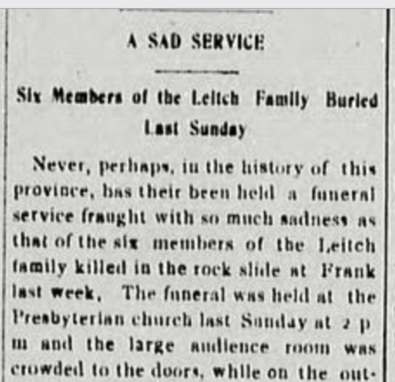 Here are pics I took of the Leitch gravestones, as well as a poignant report in the Cranbrook Herald of the funeral at the Cranbrook Presbyterian Church on Sunday, May 3, 1903. Today, Frank in southwest Alberta is about a two-hour drive from Cranbrook, but in 1903 the only way to travel in that area was by rail. and the Frank Slide crossed and covered the CPR line. In retrospect, it is remarkable that all of the funeral, casket and burial arrangements could be completed in just a few days. Train arrangements were greatly hindered by the slide which crossed and covered the rail line. The bodies of the parents and two older boys were quickly found, but it took the team of rescuers several hours to recover the bodies of the two younger boys.