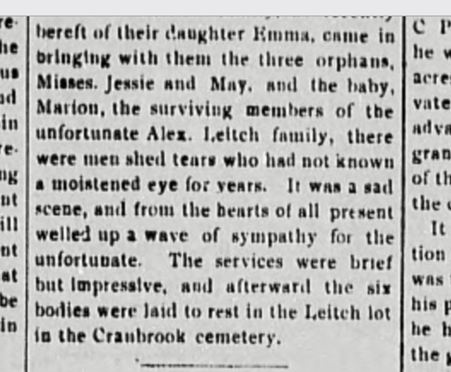 The funeral at the Cranbook Presbyterian Church for the six members of the Leitch family on May 3, 1903 was packed to overflowing with mourners, according to the Cranbrook Herald. The six bodies were laid to rest in the Cranbrook cemetery.