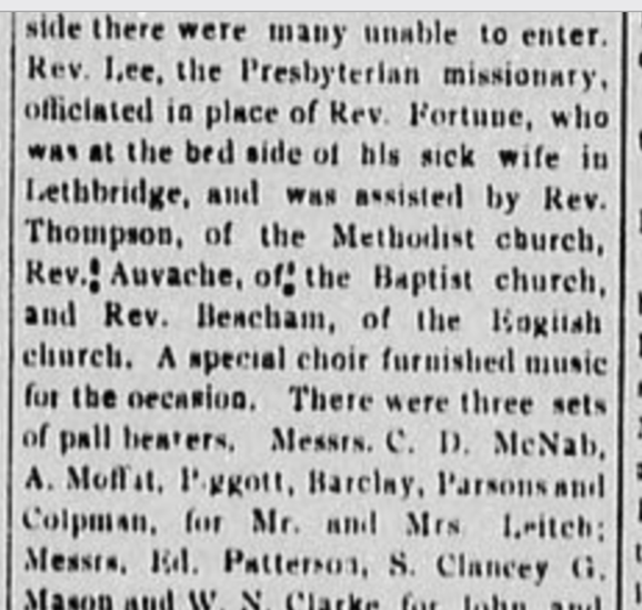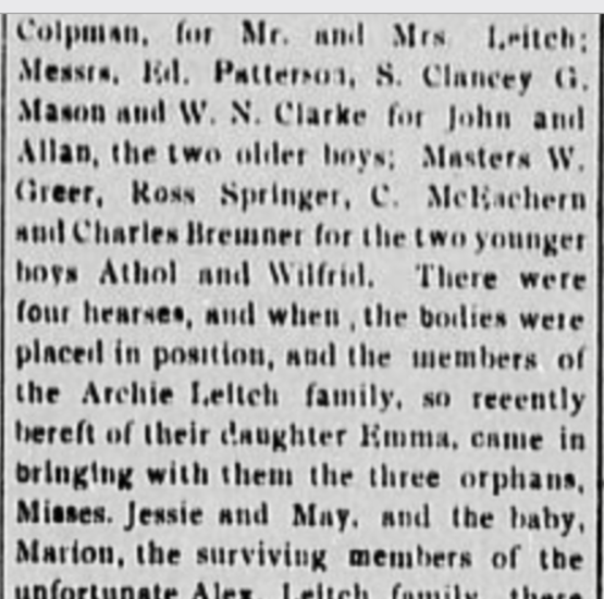 Report in the Cranbrook Herald, May 7, 1903, of the Leitch family funeral on Sunday, May 4. 1903.