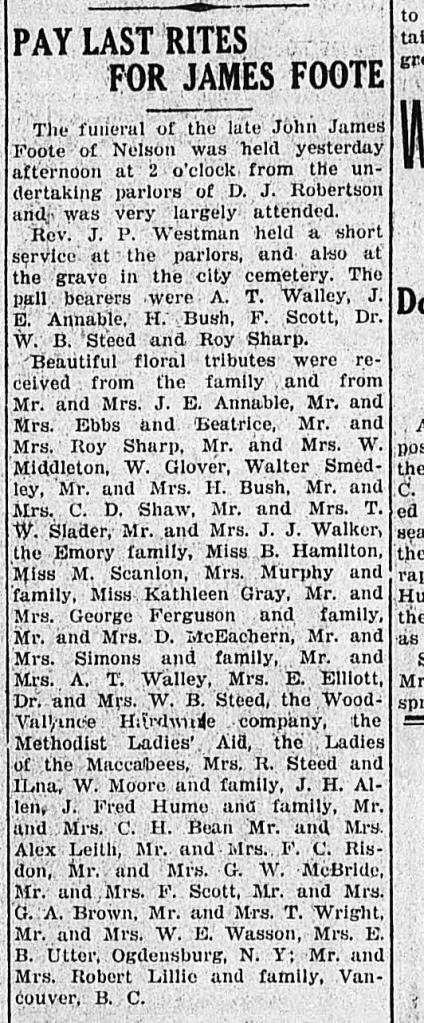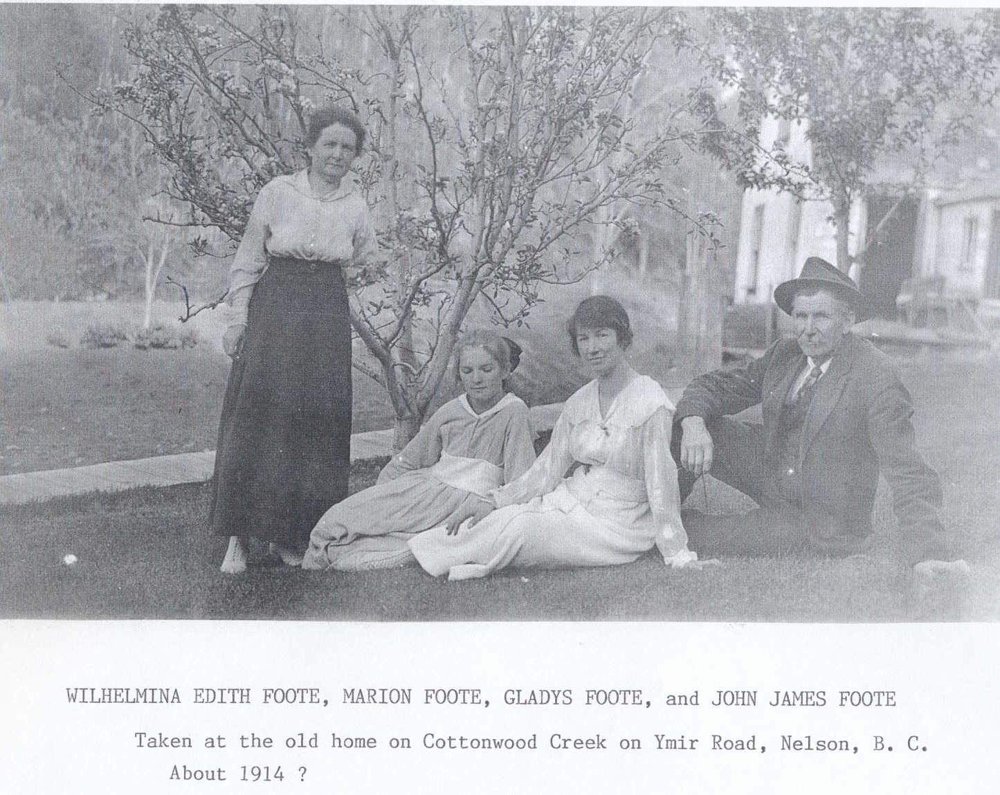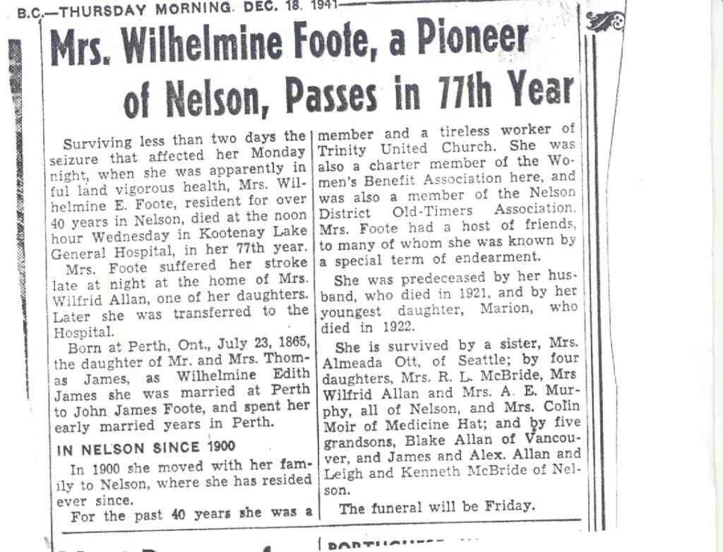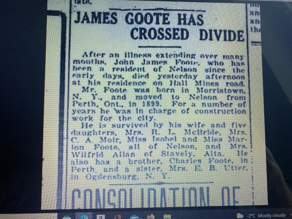 Snowbound and virus-wary in January 2022, this seems like a good time to update and share family history info on great-grandparents John James “Jim” Foote and Wilhelmine Edith James (always known by her middle name Edith). Here are some stories and pics of Jim and Edith and their five daughters (never had a son), as well as Nelson Daily News clippings that describe their lives in the young City of Nelson.