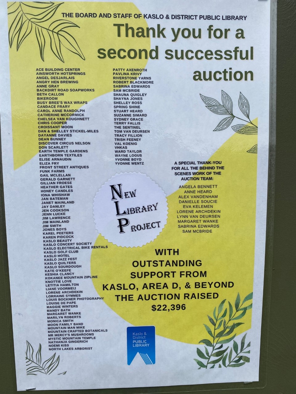 The Online Auction in April 2022 in support of the New Library Project in Kaslo, British Columbia raised a total of $22,396 – more than 10% above its fund-raising target.