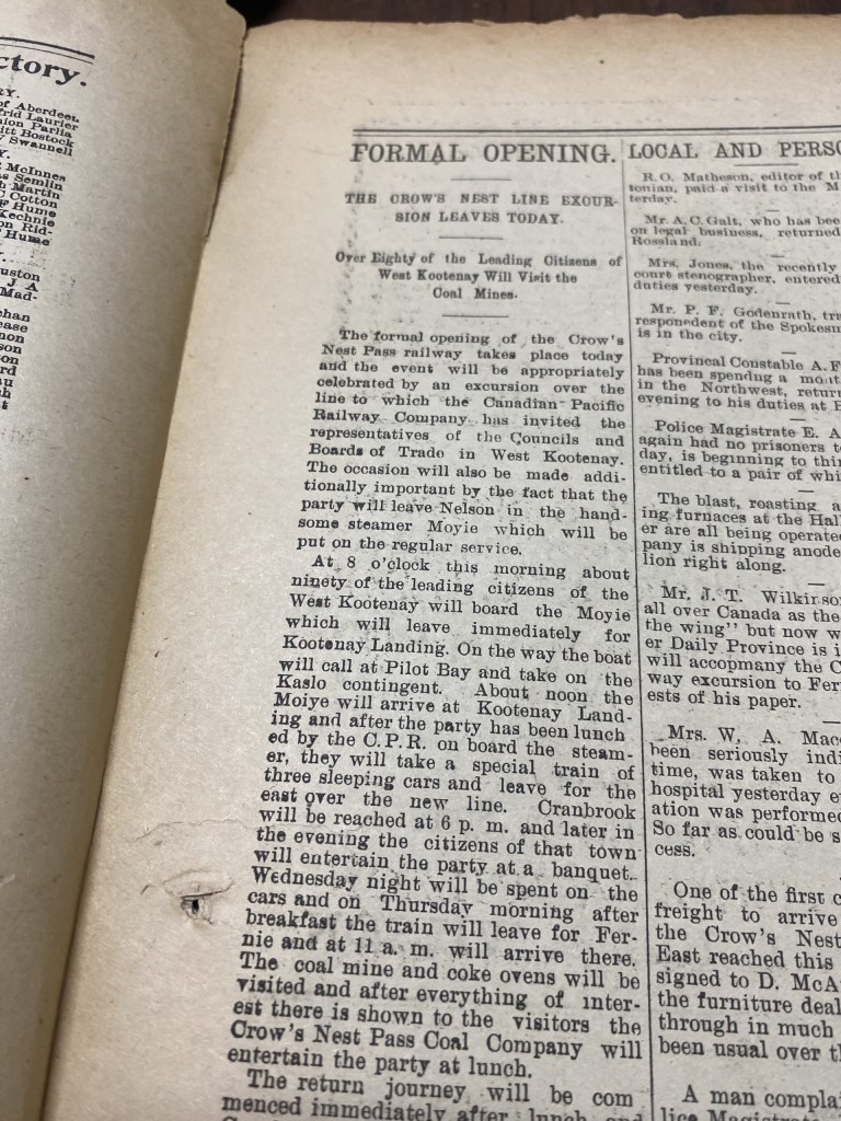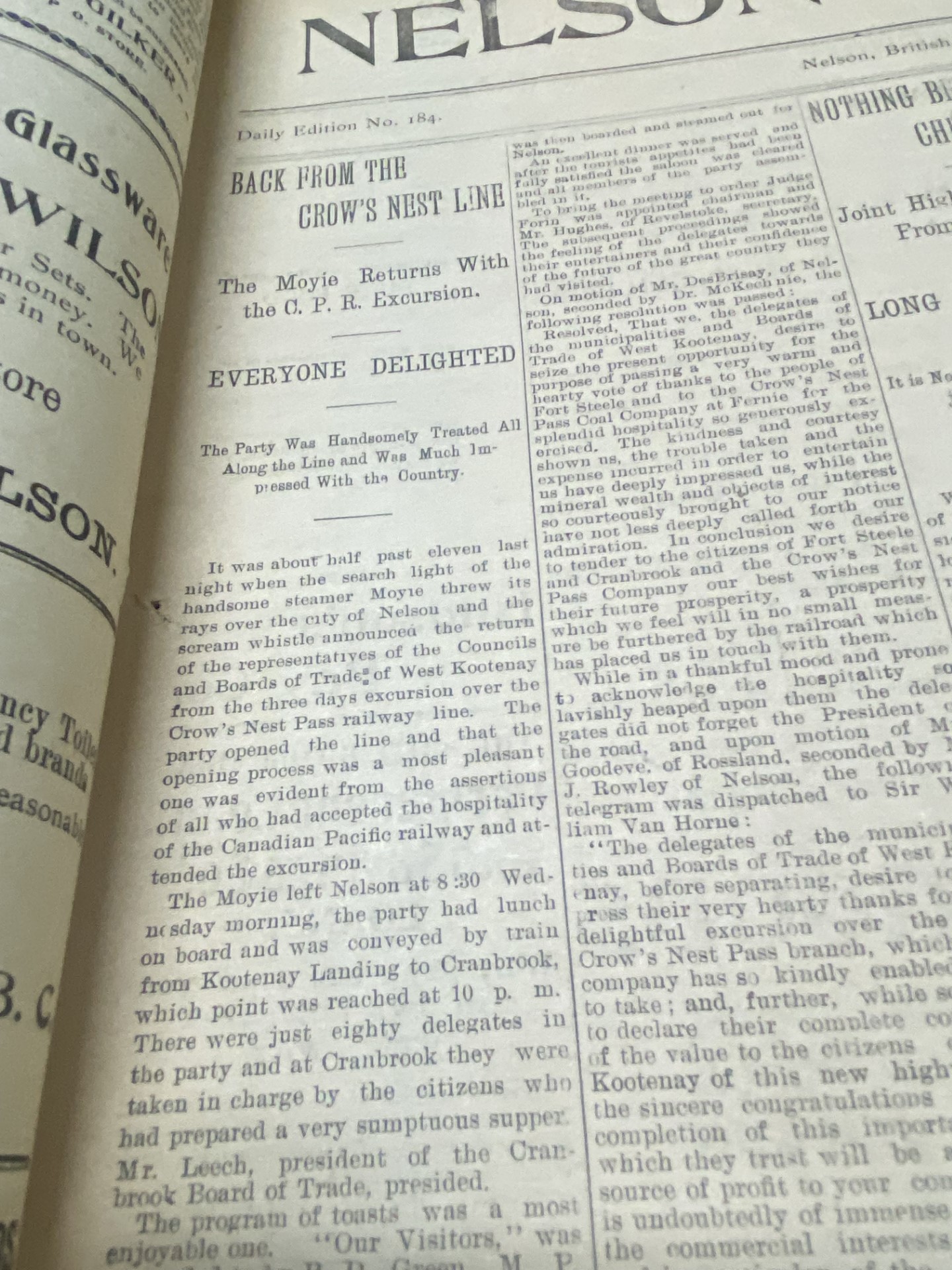 S.S. Moyie seen overlooking Kaslo Bay in September 2023.front page story in Dec. 7, 1898 issue of Nelson Daily MinerFrancis White “Frank” Peters (1860-1933), who was in charge of the VIP excursion.from December 8, 1898 Nelson Daily Minerfrom December 11, 1898 Nelson Daily Miner