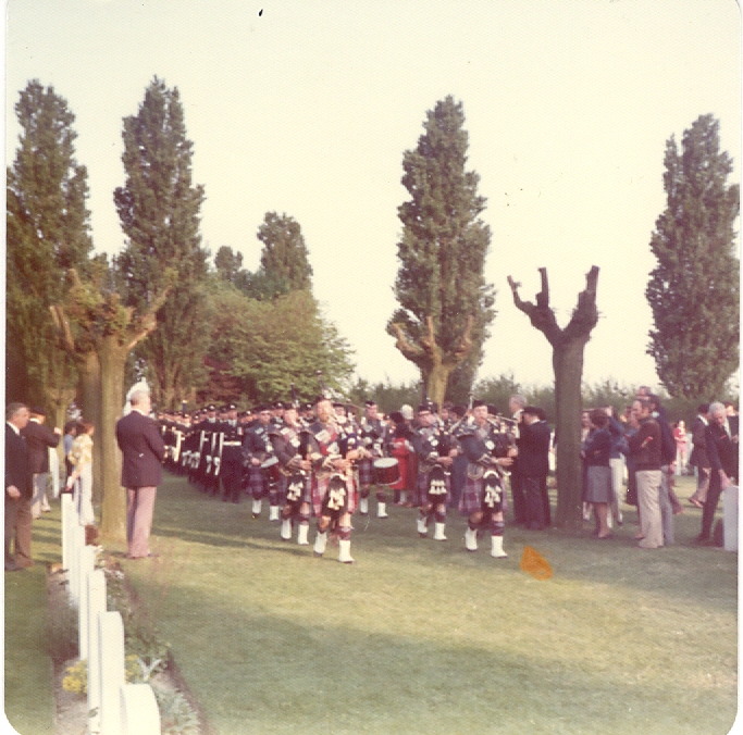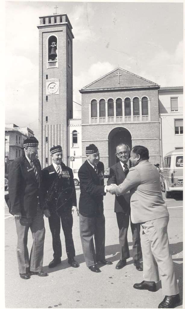 In 1975 Leigh was among 300 Canadian veterans to attend the 30th anniversary of the Italian Campaign led by Veterans Affairs minister Daniel McDonald, who himself was seriously injured in Italy, losing his left arm and leg in battle there. Leigh preferred to put the war behind him and normally did not participate in reunions, but was strongly encouraged by his Seaforth friends to go to this one, as it included a memorial ceremony at the Coriano Ridge cemetery which has Ken’s grave, which he had never visited.