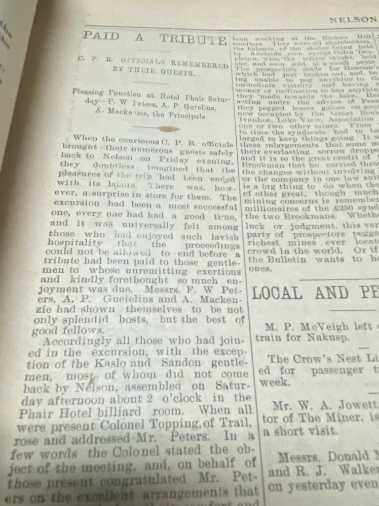 On Saturday, December 10, a meeting was held in the Phair Hotel billiard room in Nelson where organizers and participants reflected on the tour. On behalf of the participants, Colonel Topping (known as the Father of Trail) presented excursion leader Frank Peters with a silver punch bowl and tea set as a token of appreciation. Unfortunately, Captain Troup was unable to attend and receive his gift, but three other CPR officials were also honoured with gifts from the travellers.
