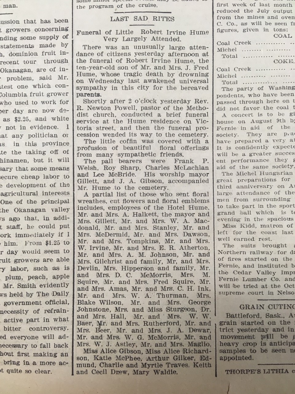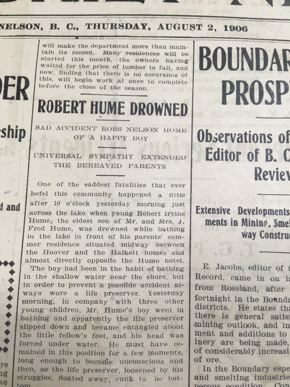 She didn’t mention the Robert Hume drowning specifically (it was before her time), but in retrospect it was among the highest-profile drownings in Nelson history, as the parents J. Fred and Lydia Hume were well-known and highly respected. From the Nelson Daily News reports, the whole city was heartbroken.