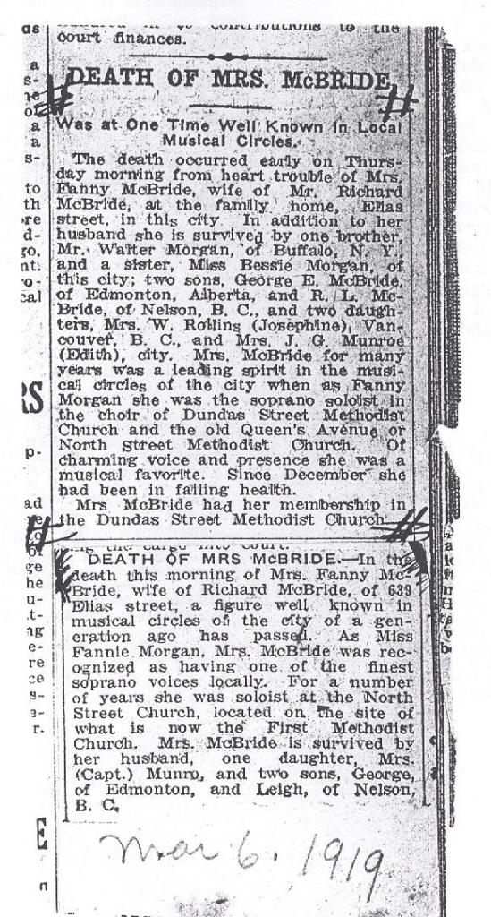 In response to a request from his niece Edith McBride for memories of the family’s early days in London, her younger brother Walter Clement Morgan (1861-1940) of Buffalo, New York said in a letter that Fanny and eldest brother Fred went to a school on Hamilton Road in London, and it was either close to the Black Horse Tavern, or in it, while Walter and other younger siblings went to the Adelaide Street school between York and King. Fanny worked at times as a dressmaker, and as a concert singer. “She had innumerable admirers, and the house was cluttered up with them almost every evening,” according to Walter. Any man among them who was shorter than six feet in height was invariably referred to by Fanny as “Little So-and-so”, such as Little Fewings, Little Johnny Traher and Little Tommy Martindale. In contrast, she called the tall and handsome Richard McBride (her future husband) “The Lovely Dick”.