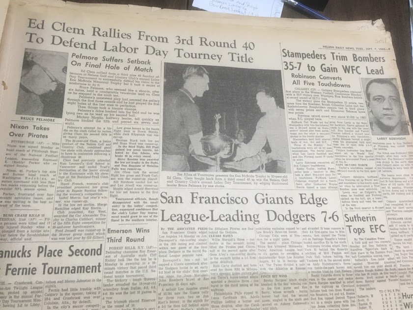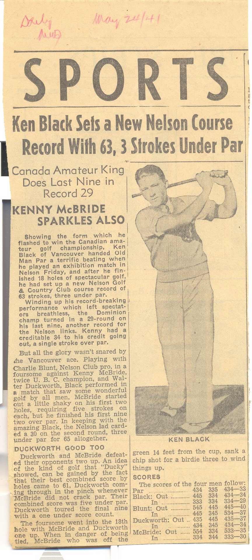 Among the mementos kept in family memorabilia is the scorecard of an exhibition match in May 1941 when the Canadian Amateur Champion Kenny Black of Vancouver came to Nelson and played a match on the course with the club champion Ken McBride, club pro Charlie Blunt, and another top local player Walter Duckworth. Black’s score of 63 set a club record, with Ken just two strokes back and the others playing well too.