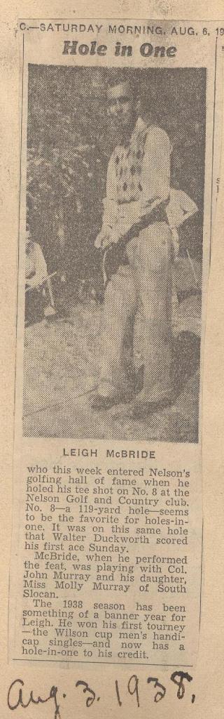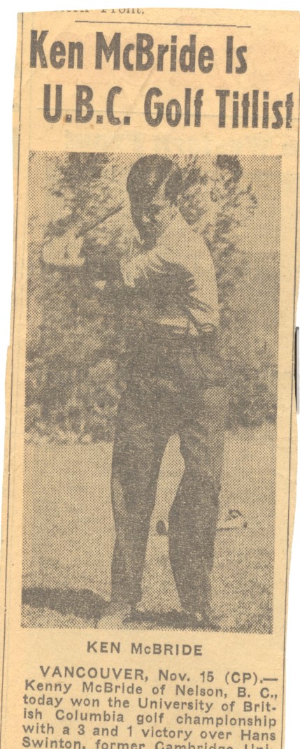 In Ken’s memory, the members of the Nelson Golf Club raised funds for the Ken McBride Memorial Trophy which was awarded to the winner of the annual Labour Day Club Championship from 1947 until 1977. Leigh often made the trophy presentation.