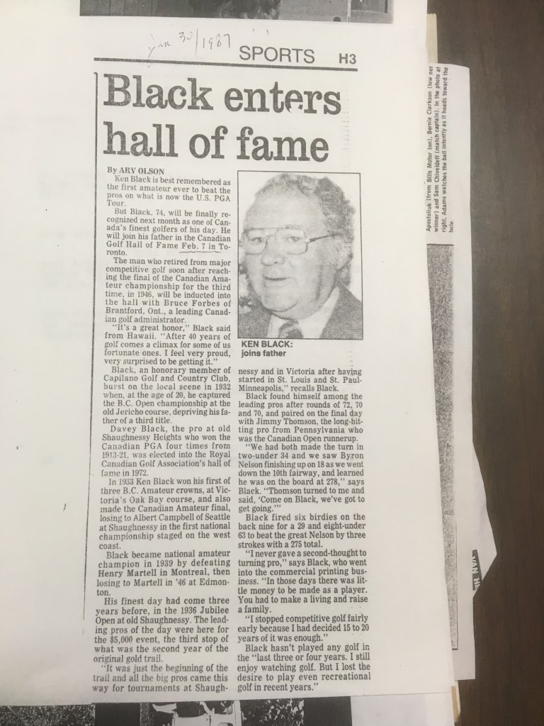 Ken Black won the Canadian Amateur Golf Championship in Quebec in 1938. The event was cancelled from 1939 to 1945 due to WW2. He was runner-up when the event resumed in 1946. He had also been runner-up in 1936. He was inducted in the B.C. Sports Hall of Fame in 1966, the Canadian Golf Hall of Fame in 1987, and the B.C. Golf Hall of Fame in 2001. He died in 1995