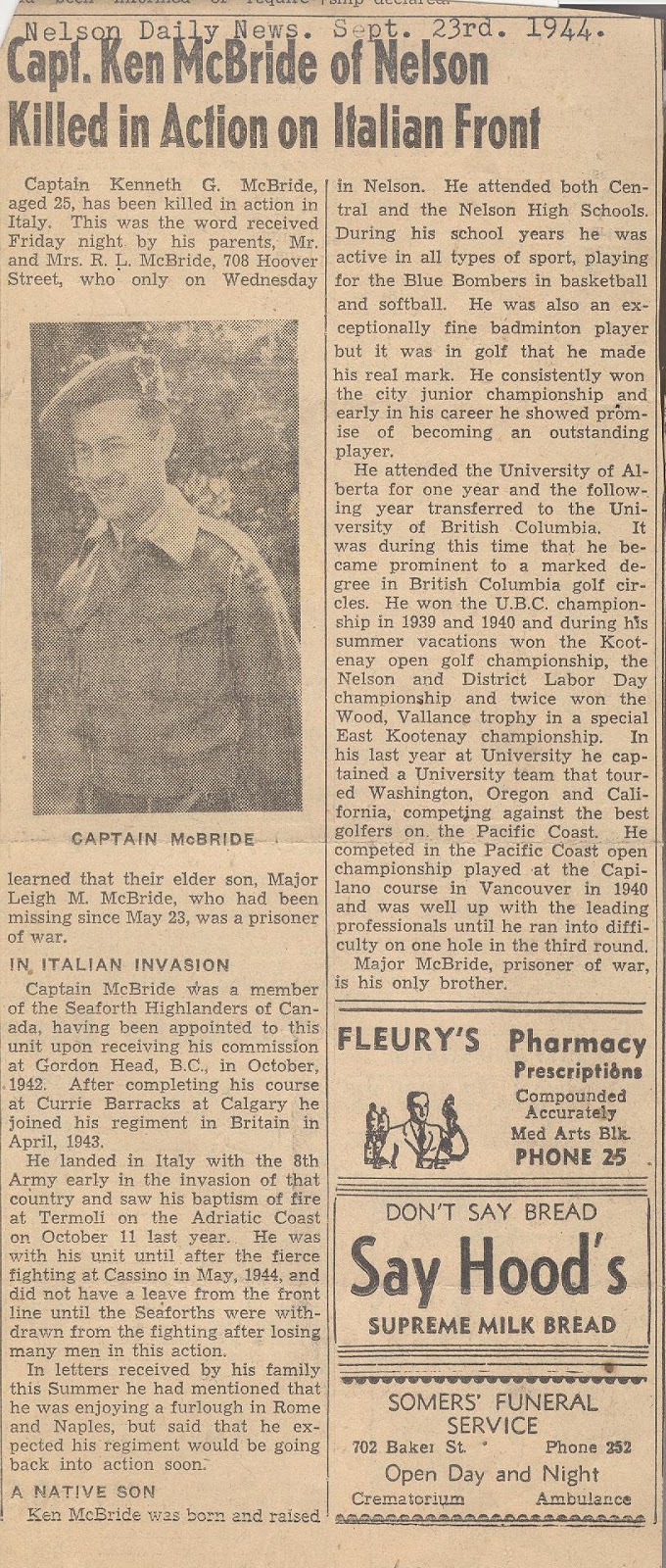 Both Leigh and Ken won Nelson and other Kootenay junior golf championships, and Ken went on to great success as captain of the UBC golf team that competed against the top American university teams, before joining Leigh as an officer with the Seaforth Highlanders of Canada regiment in 1942. Leigh rose to Major and was wounded on two occasions, including the loss of an eye and multiple body wounds in his last action on May 24, 1944, when he was found unconscious by German soldiers and taken to a German hospital for treatment and then a series of prison camps until returning to Canada in a wounded prisoner exchange in January 1945. While he was in a POW camp he heard that his brother Ken was killed in action near Rimini, Italy on September 16, 1944.