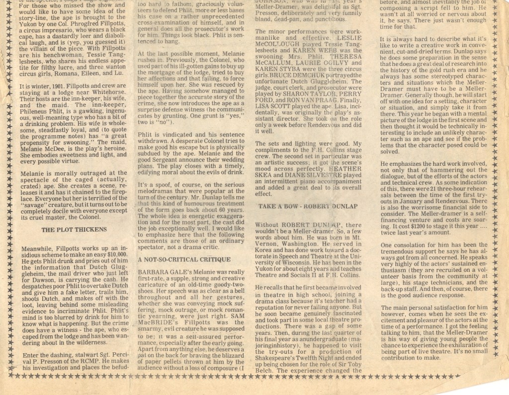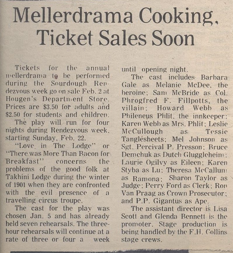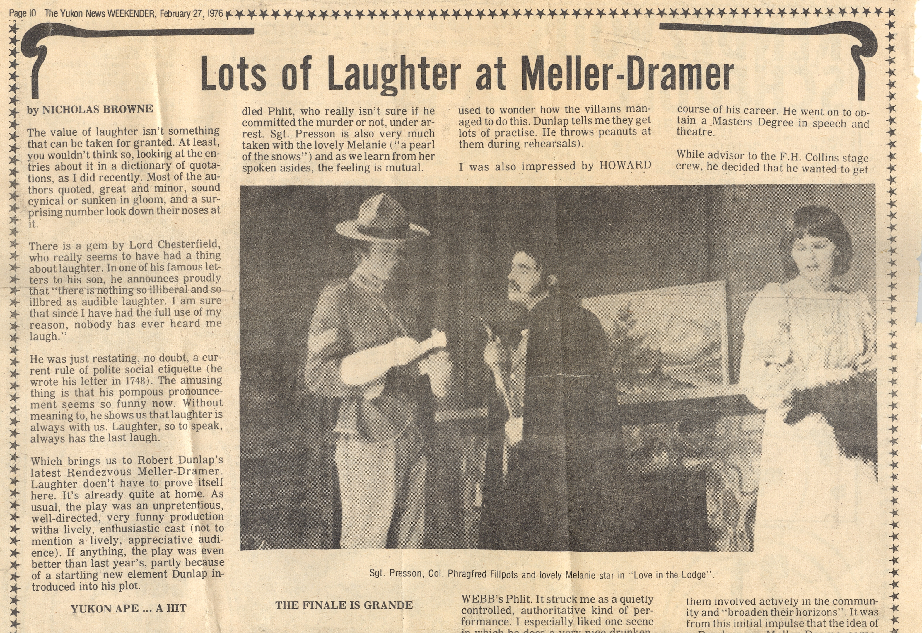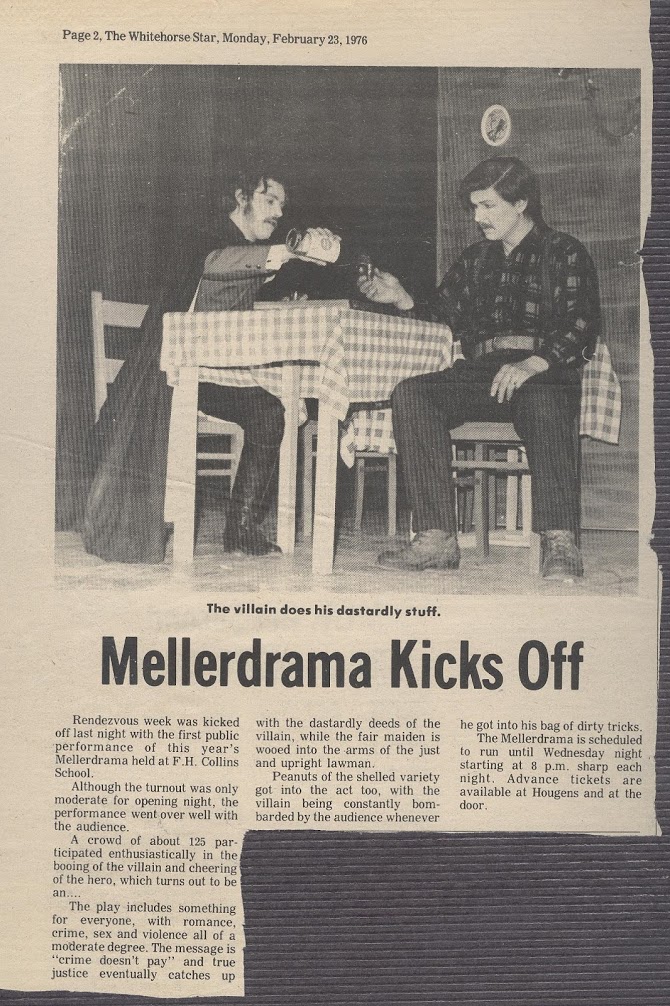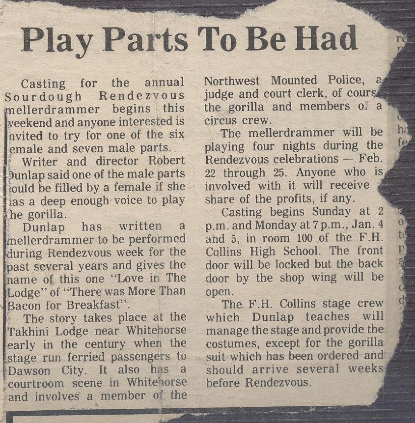 Starting the job in early November 1975, I had a lot to learn because it was my first PR-type job, and I knew very little about the Yukon. Looking for clubs or activities that I might want to participate in, I noticed in the Whitehorse Star newspaper an article about auditions for the annual “Sourdough Rendezvous Mellerdrammer”.