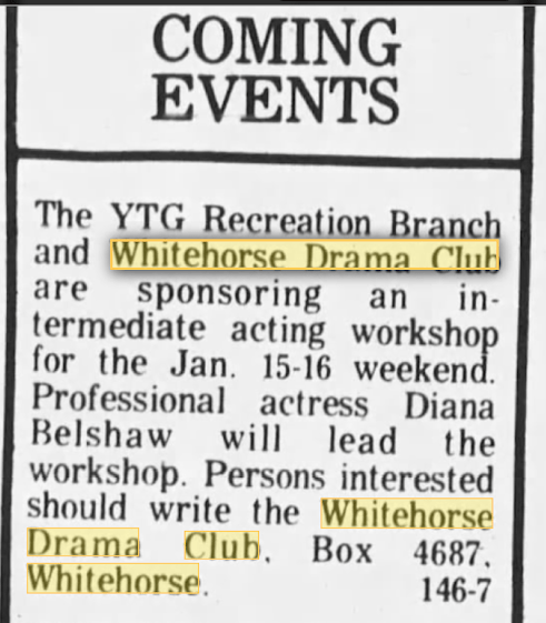 As noted in the newspaper ad above, another project of the drama club at the time was to get some professional training in acting. For this we partnered with the Yukon Territorial Government’s Recreation Branch to sponsor an intermediate acting workshop over a weekend in January. As it turned out, Diana Belshaw was tied up with theatre commitments in Vancouver and could not come. In her place, we were very pleased to benefit from the expertise of professional director and actress Kathryn Shaw.
