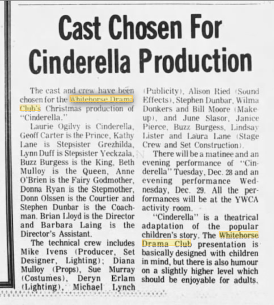 For the auditions, we welcomed the general public as well as local school students. I was very pleased that several of the F.H. Collins High School students who were in the Sourdough Rendezvous Mellerdrammer with me in early 1976 came out for the auditions, including Laurie Ogilvy, who took on the lead role of Cinderella.