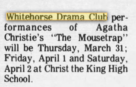 Someone suggested doing Agatha Christie’s “The Mousetrap”, as it was setting records as the world’s longest-running play in London. The group agreed that it would be a great show to put on, but it was thought unlikely that the performance rights would be available for an amateur club like ours. When we found out the play was unavailable in England, but available for rent in other countries, we got quite excited about doing it.