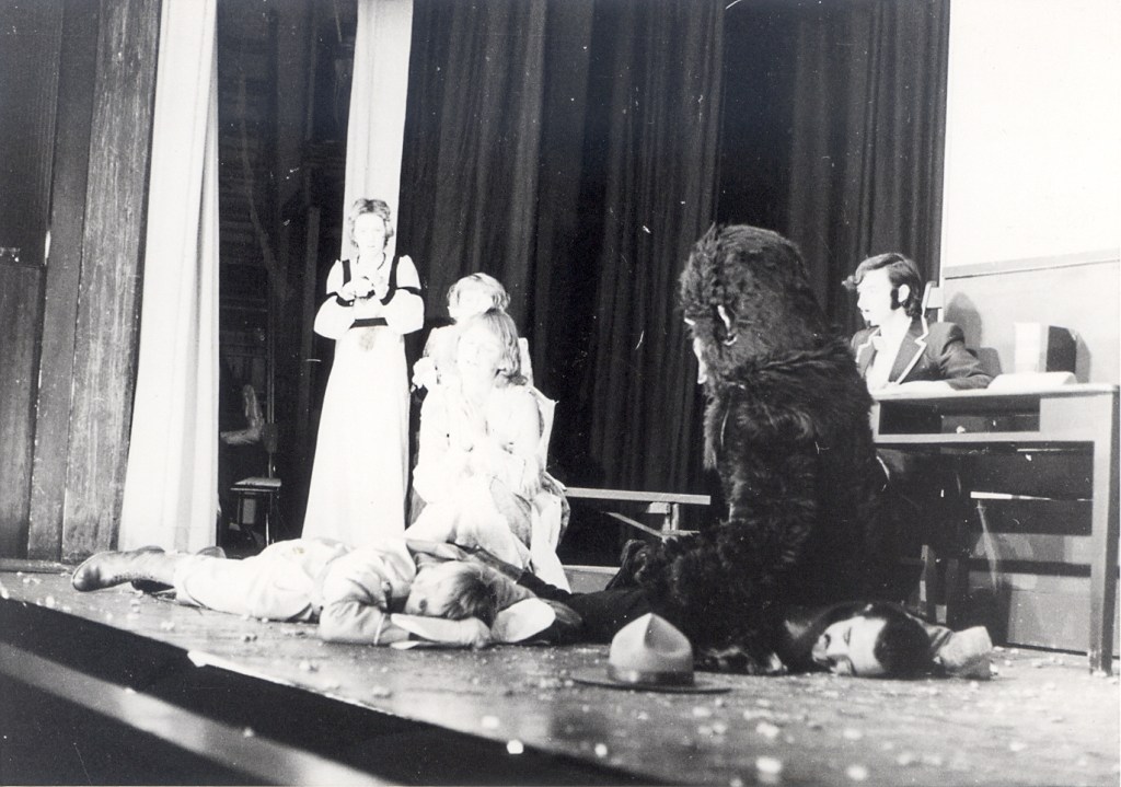 This is the only colour photo I have from the show, taken by my room-mate Mike Panchuk. I am the bad guy doing an “aside” to the audience. Behind me are the heroine Melanie McDee and the policeman.Court scene, as the villain has framed an innocent man who is being tried for the crime. This pic shows audience members throwing peanuts at the villain.villain capturing heroine.Villain about to carry off heroine — only to be foiled by an ape!The Yukon Ape has conquered the villain and saved the day. Notice all the peanuts on the stage, mostly thrown at me.
