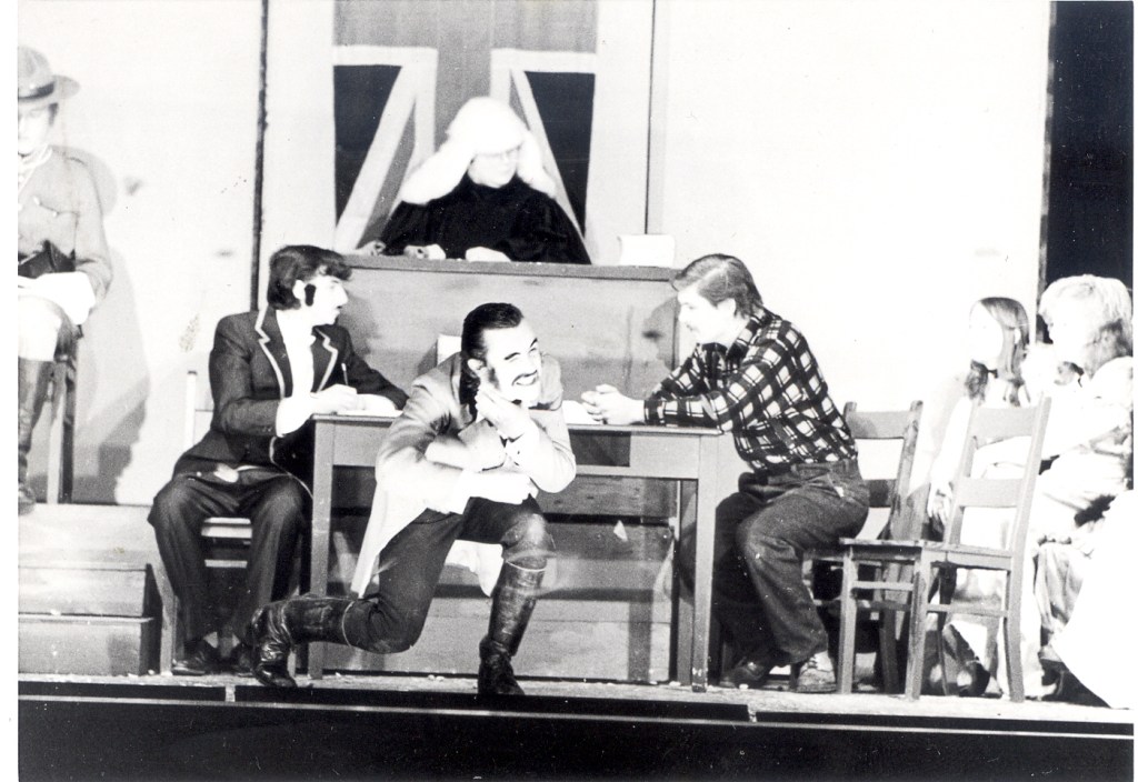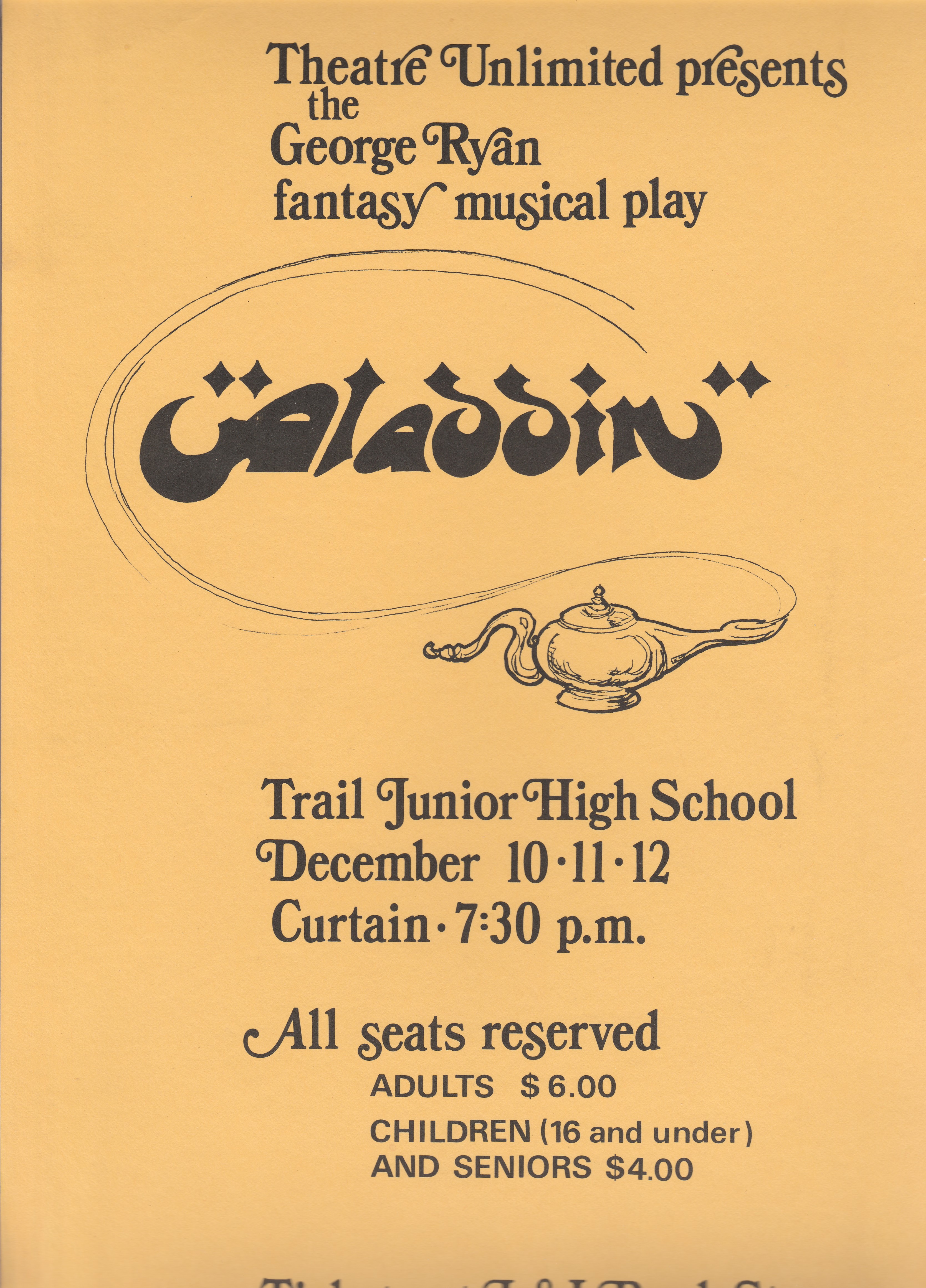 Circumstances resulted in this 1981 show being produced by Trail Theatre Unlimited, with original music by George Ryan. Aside from once again producing great artwork for the posters and programs, George was not a stage performer in this show. I had a couple of minor roles as well singing in the men’s chorus.
