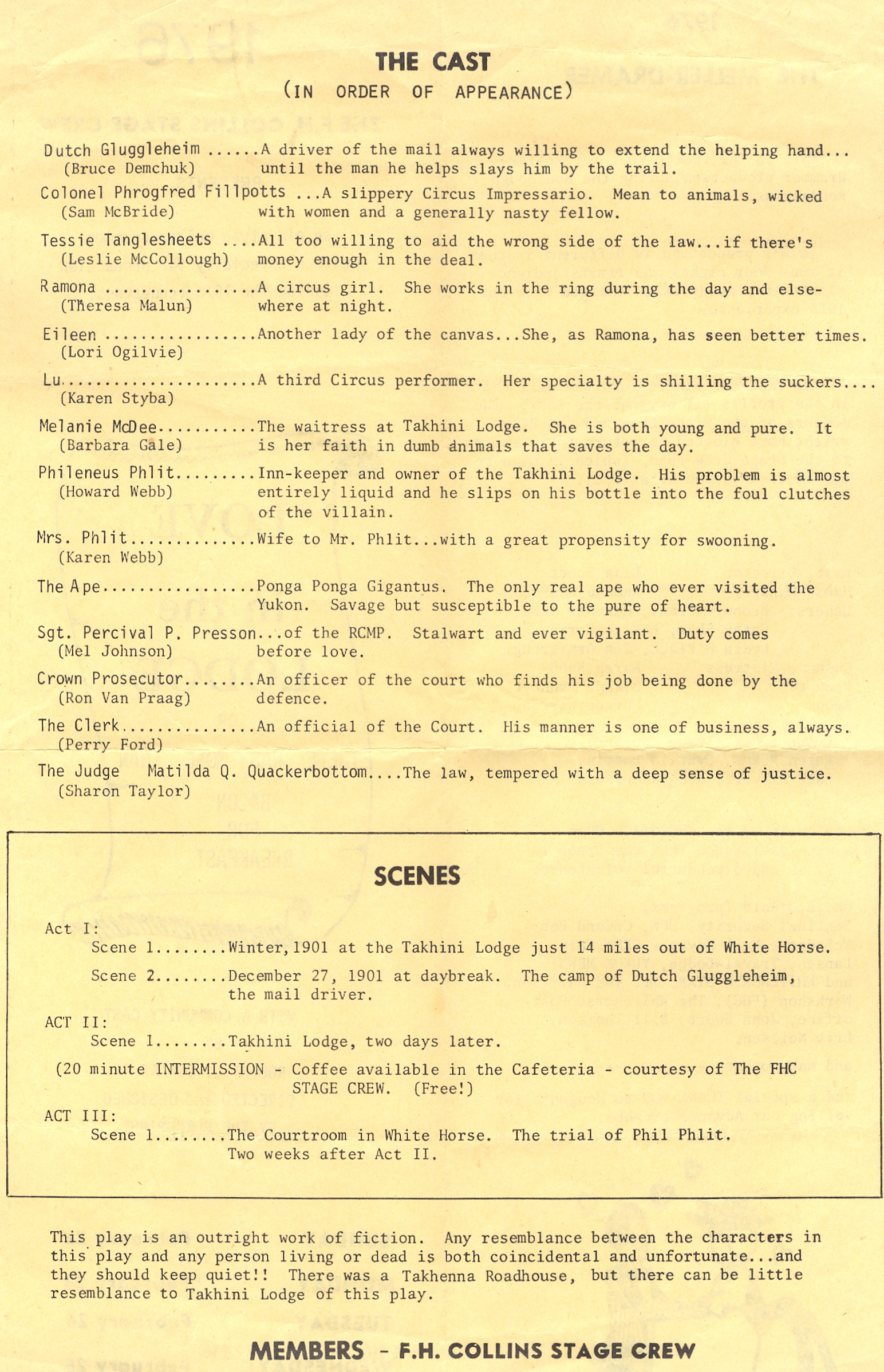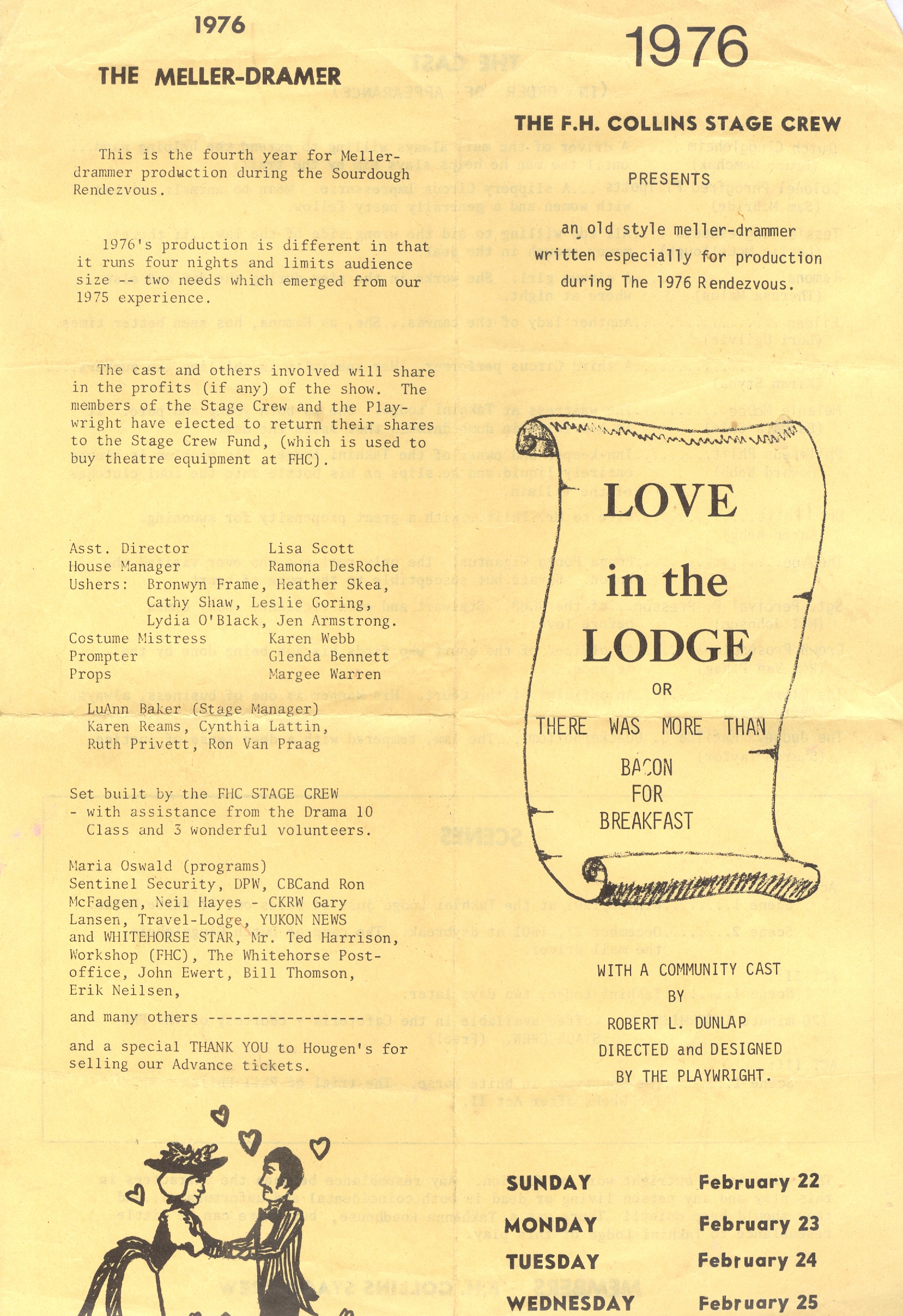 It was a production of the F.H. Collins High School, but adults in the community were invited to try out for one of the adult roles, or to help backstage for a show called “Love at the Lodge – Or There Was More Than Bacon for Breakfast”, written and directed by the school’s drama teacher Robert L. Dunlap. He had done annual shows like this for several years at the school, all of them written by him the previous summer. The shows were set in the 1890s era of the Klondike Gold Rush when Yukon was the centre of the world’s attention, in the style of good versus evil melodramas popular at that time.
