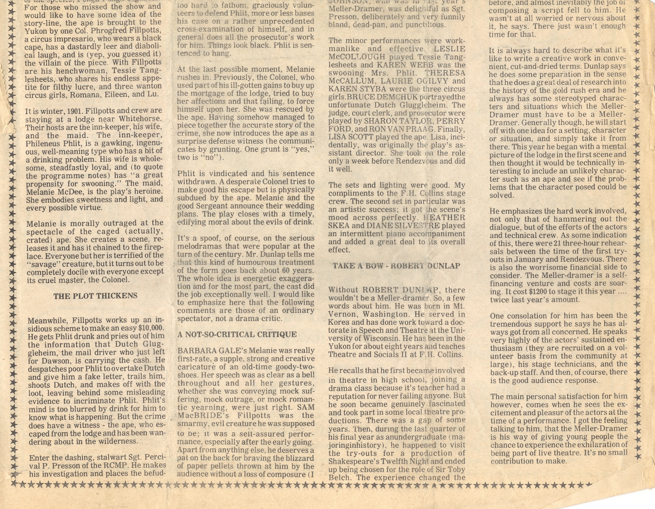 Remembering how much I enjoyed watching live theatre in London, I agreed to give it a try. I then found myself having to memorize hundreds of lines in the script, and going to three or more rehearsals a week for five weeks. While Dunlap was a hard taskmaster with both students and adults in the show, the rehearsals were usually quite enjoyable, among a fun group of participants. The three performances of the show were in the third week of February 1976, coinciding with Whitehorse’s annual winter festival known as Sourdough Rendezvous, which celebrated Yukon’s heritage memorialized in the works of poet Robert Service, such as “The Cremation of Sam Magee” and “The Spell of the Yukon”.
