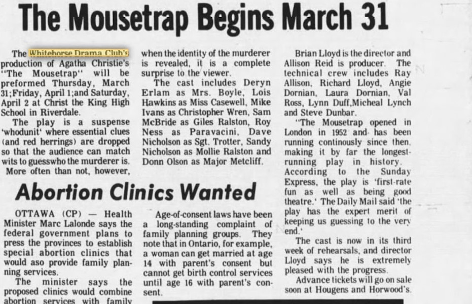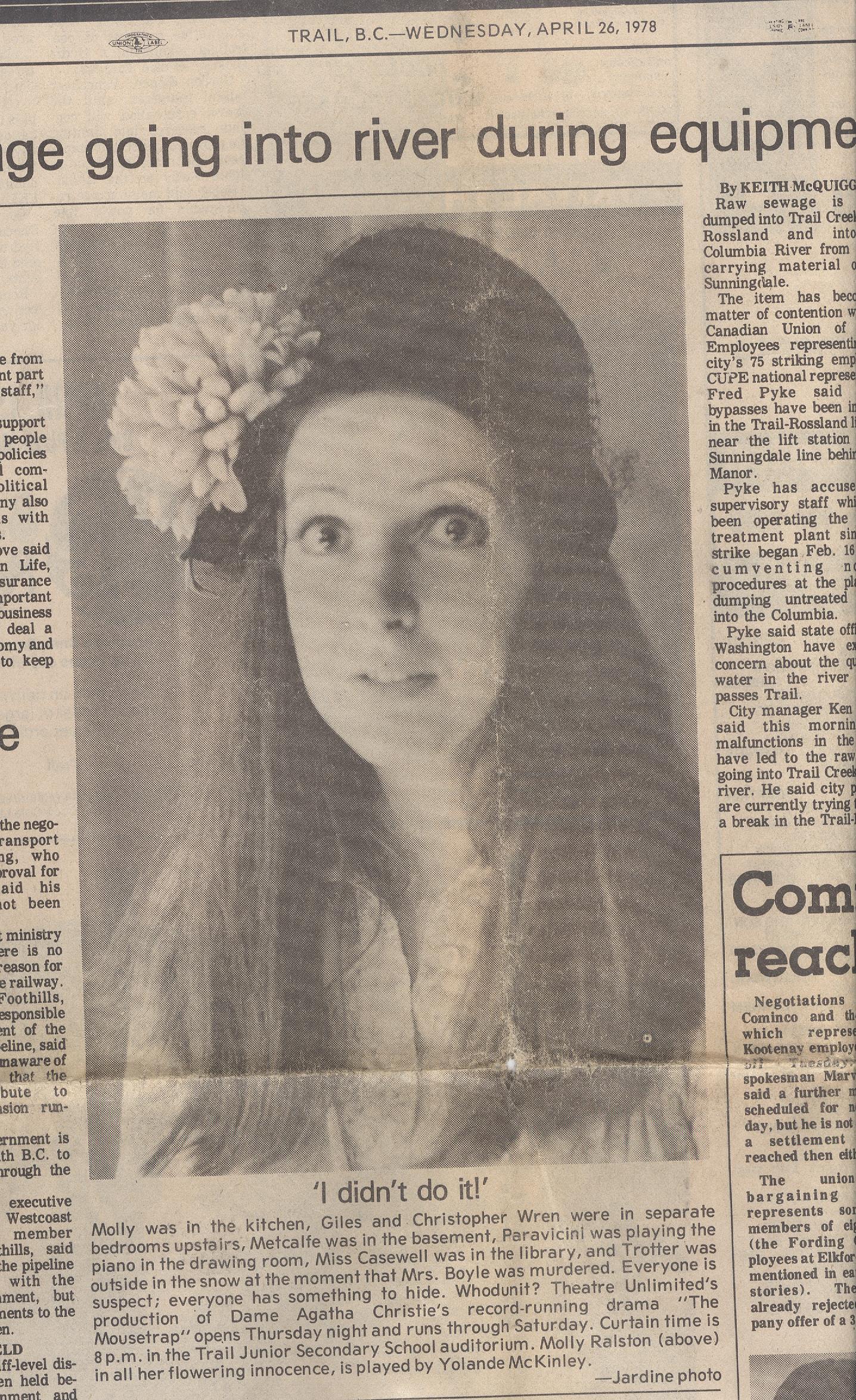 In early January, 1978 the executive of Trail Theatre Unlimited met to plan for the club’s spring production. The consensus was that the group should build on the successful momentum of their debut show “Dirty Work at the Crossroads” with a spring show that was somewhat more serious than the farce-like melodrama “Dirty Work”. As a member of the executive of Theatre Unlimited, I had suggested to others that we do “something like” The Mousetrap, which I had watched in London in the summer of 1975 and then two years later performed in with the Whitehorse Drama Club in the Yukon. When we could not think of a good alternative, the decision was made to do “The Mousetrap”.