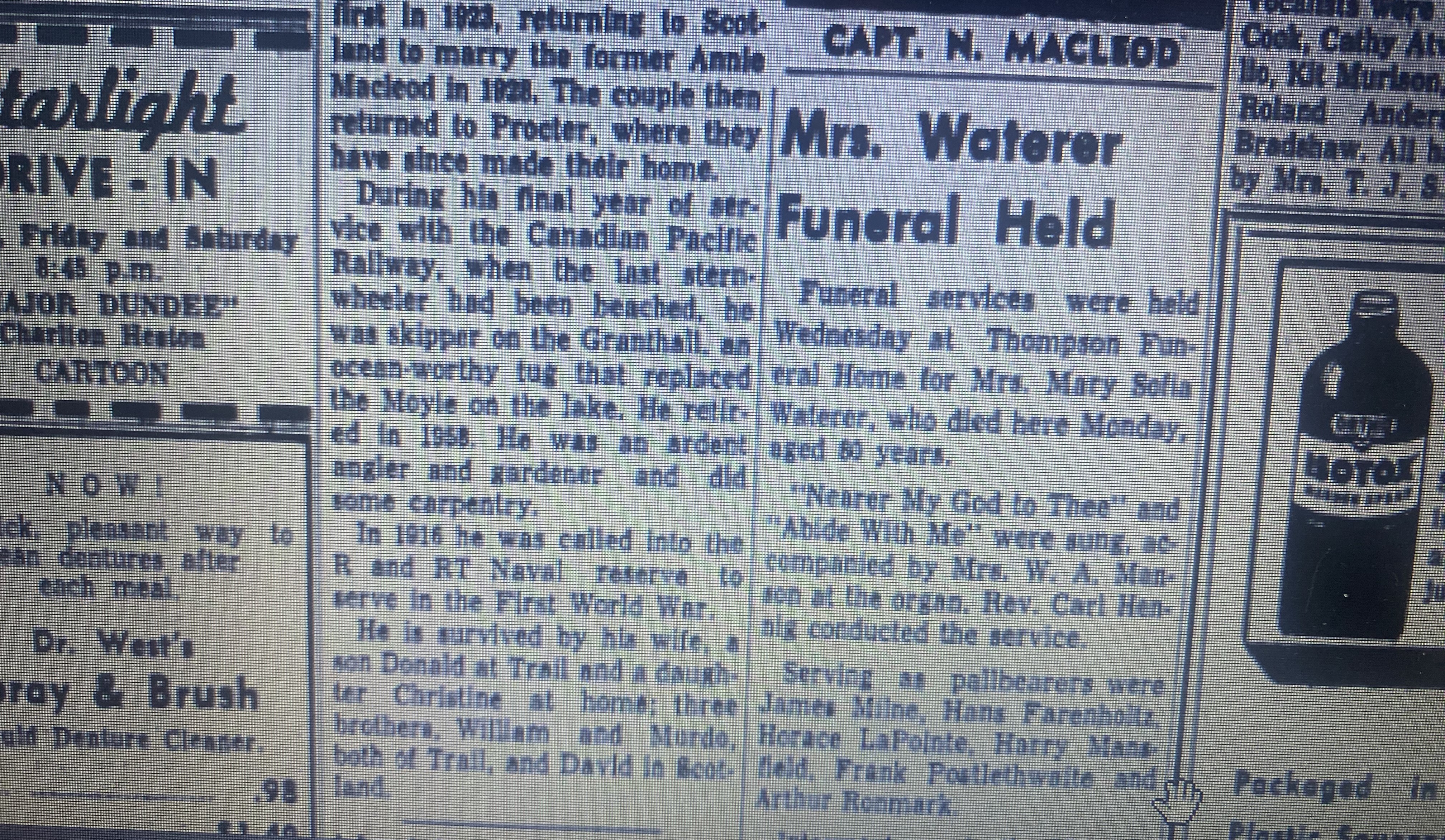 More details of his life are in the June 9, 1966 Daily News obituary story attached here. Also in “Kootenay Outlet Reflections: History of Proctor, Longbeach, Balfour and Queens Bay”, published 1988, and 2013 with updates.